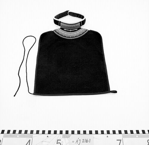 Barmkläde, mans med bröststycket i mörkt kläde. Halsremmen har skinnskoning och är applikerad framtill med grönt, blått och rött kläde. Den halvmåneformade "spegeln", leahta, är sammansatt med kläde i olika färger och broderade med tenntråd.