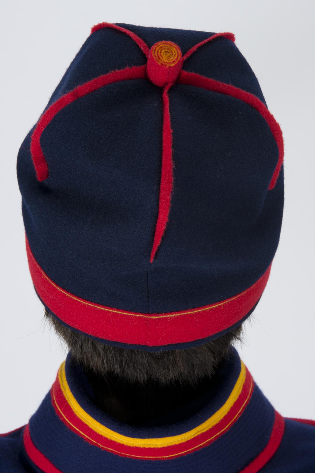 • En mansmössa i blått kläde med dekoration i rött och gult kläde. Högst upp en rund klädes "tofs".