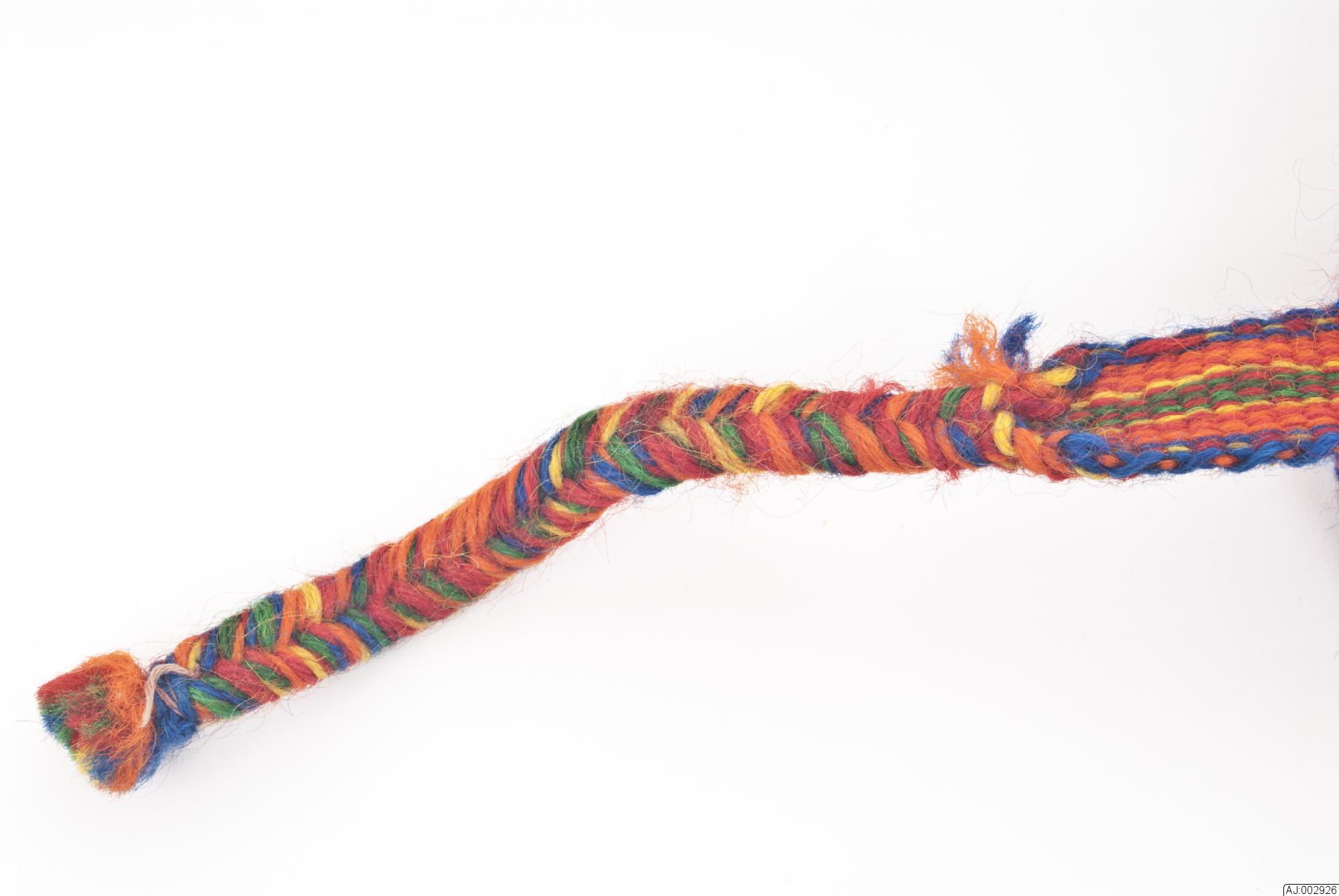 • Vävda skoband i kraftigt garn i färgerna orange, rött, blått, grönt och gult. Röda mönstertrådar och oranget inslag.