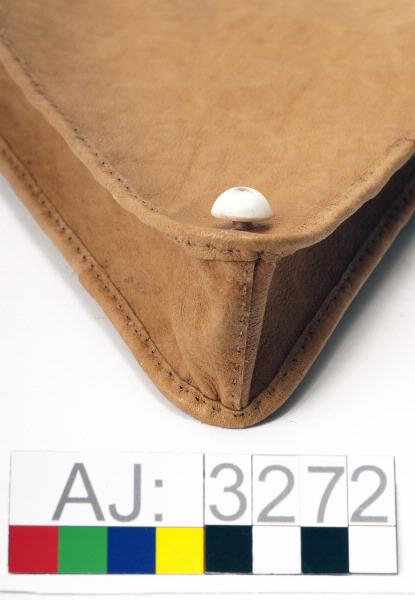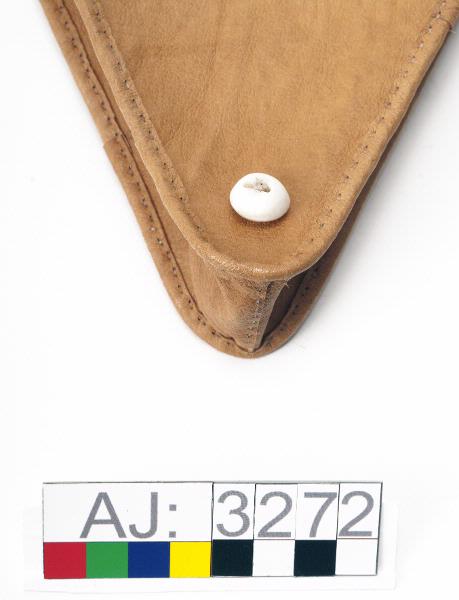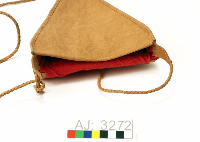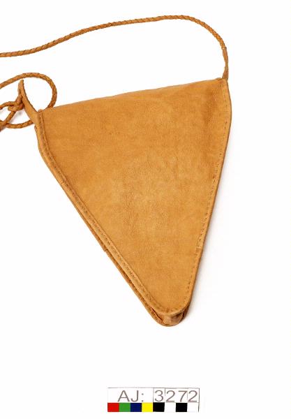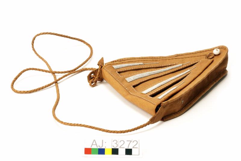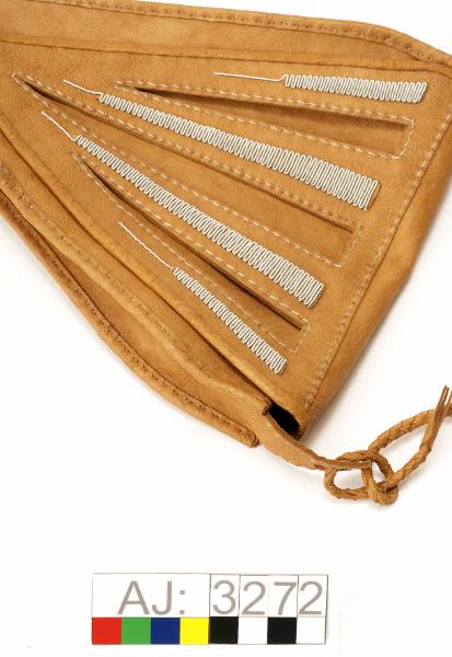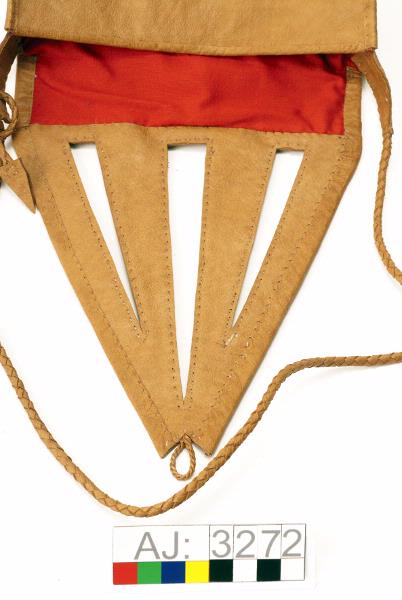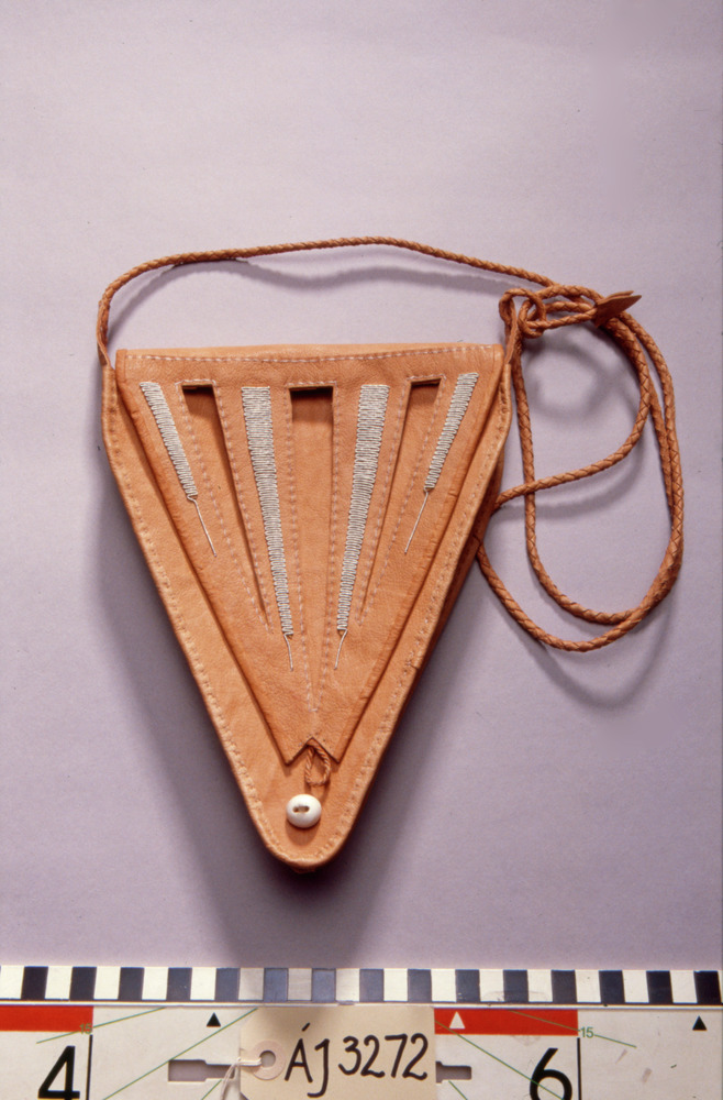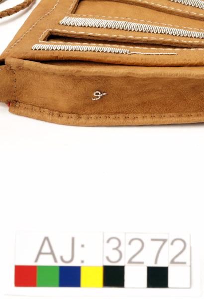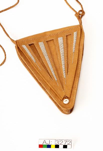 Hanväska i garvat renskinn med tenntrådsbroderier. Väskan har formen av en triangel med spetsen nedåt. Locket är broderat med tenntråd i täta sick-sackrader och har tre urklippta "hål" i form av trekanter. Locket har en ögla längst ned att knäppa fast vid en rund hornknapp. Axelremmen är av rundflätat skinn, som är fastsydd på en sidan och avslutas med en tretungad tofs i andra ändan som är fastkn...