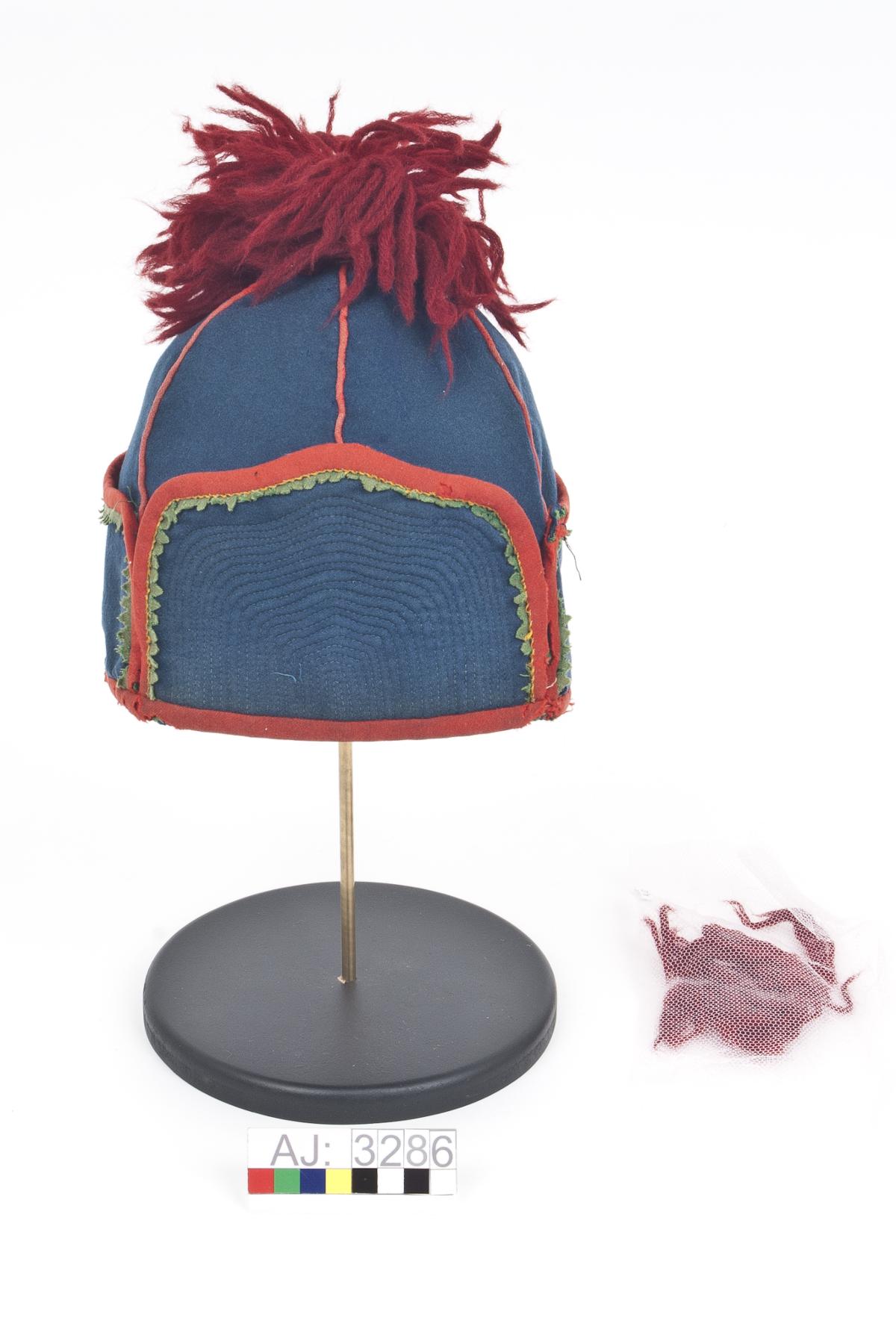 Blå kilmössa med vinröd tofs, sex kilar. I sömmen mellan kilarna är inlagt dubbelvikt rött kläde. Bräm (mellan 9 - 11 cm brett) runt mössans nederkant. Brämet delat, framdelen, snijpe, kan vid starkt solljus vikas ner och användas som skärm. Brämet kantat med röd klädesremsa och grön uddklippt klädesremsa. På framdelen är en gul ulltråd fastsydd mellan det röda och det gröna klädet. Mössan kantad ...