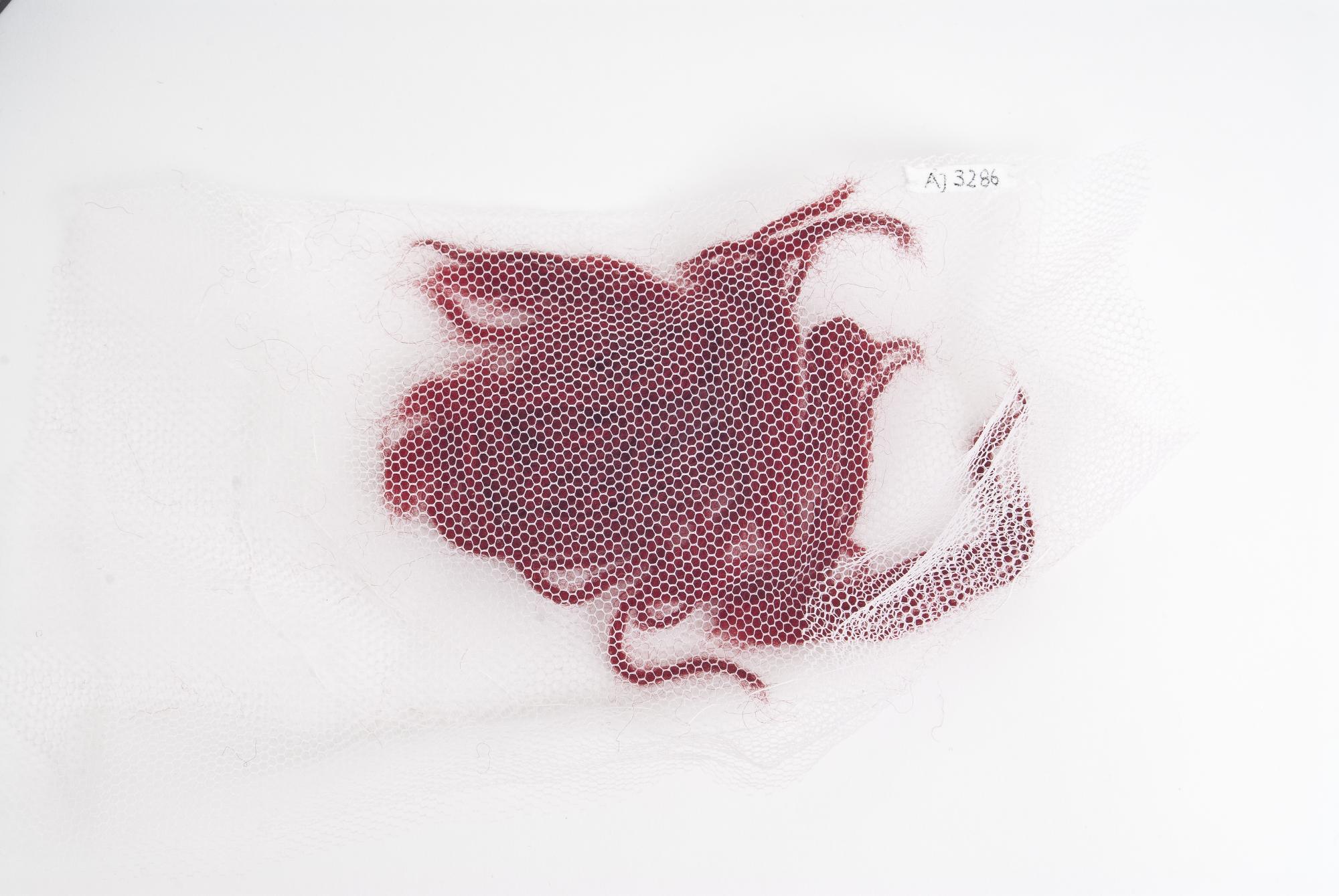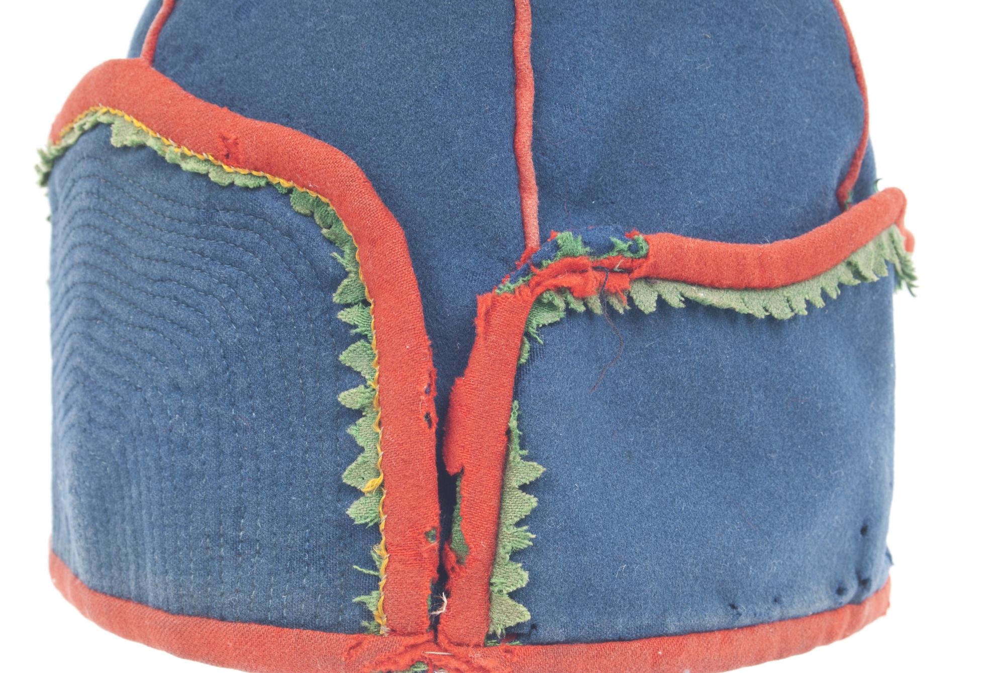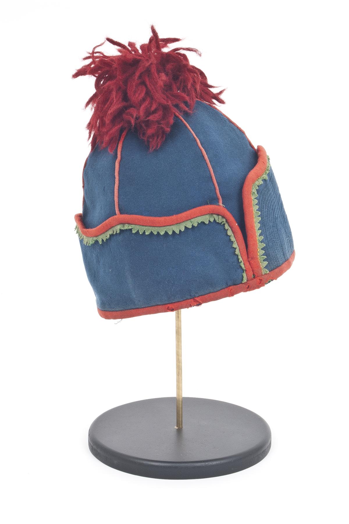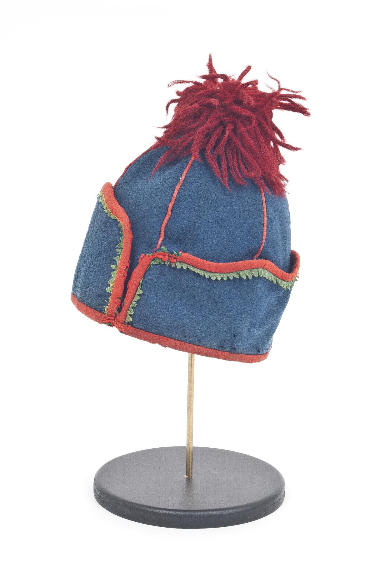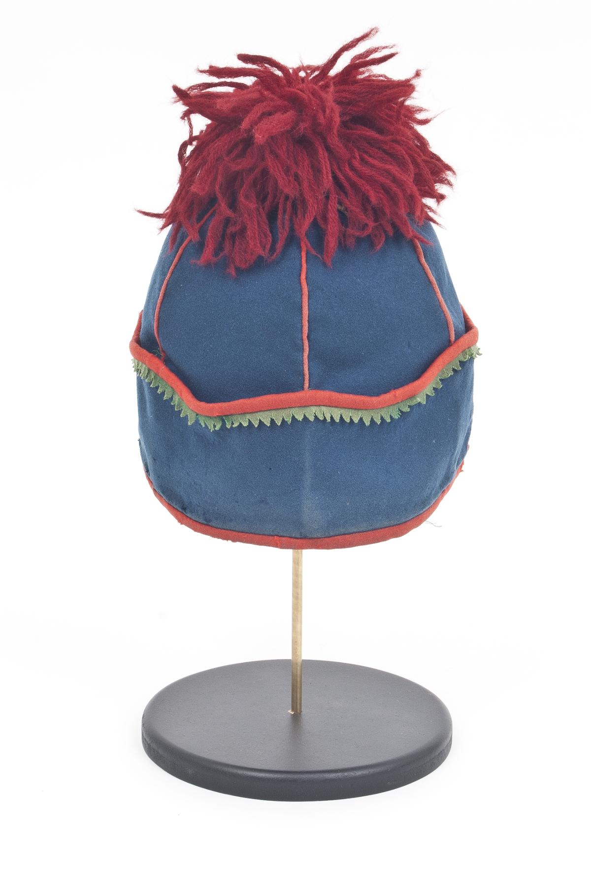 Blå kilmössa med vinröd tofs, sex kilar. I sömmen mellan kilarna är inlagt dubbelvikt rött kläde. Bräm (mellan 9 - 11 cm brett) runt mössans nederkant. Brämet delat, framdelen, snijpe, kan vid starkt solljus vikas ner och användas som skärm. Brämet kantat med röd klädesremsa och grön uddklippt klädesremsa. På framdelen är en gul ulltråd fastsydd mellan det röda och det gröna klädet. Mössan kantad längst ner med rött kläde. Fodrad med kypertvävt grått ylletyg. Maskinsömmade linjer på frambrämet.