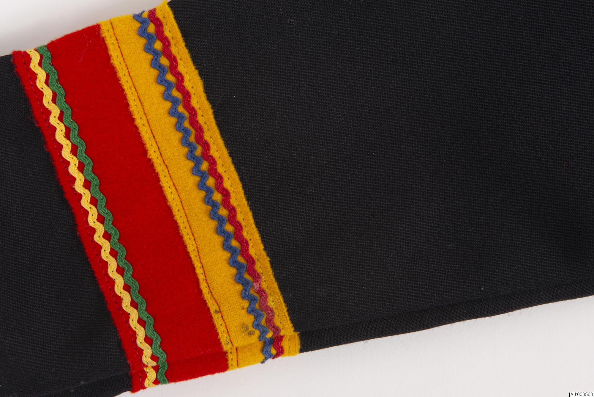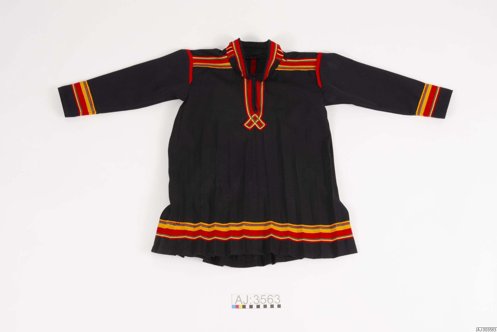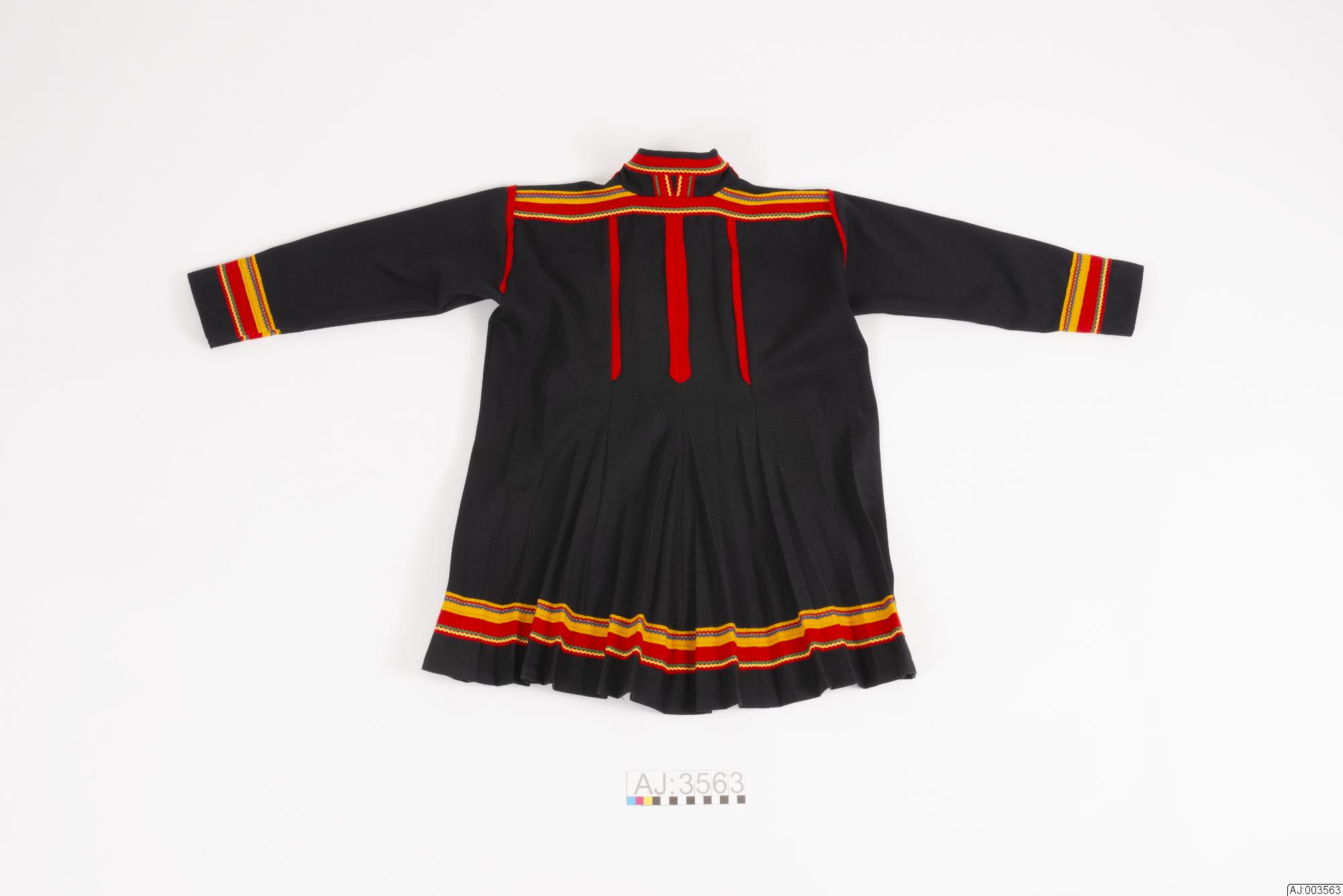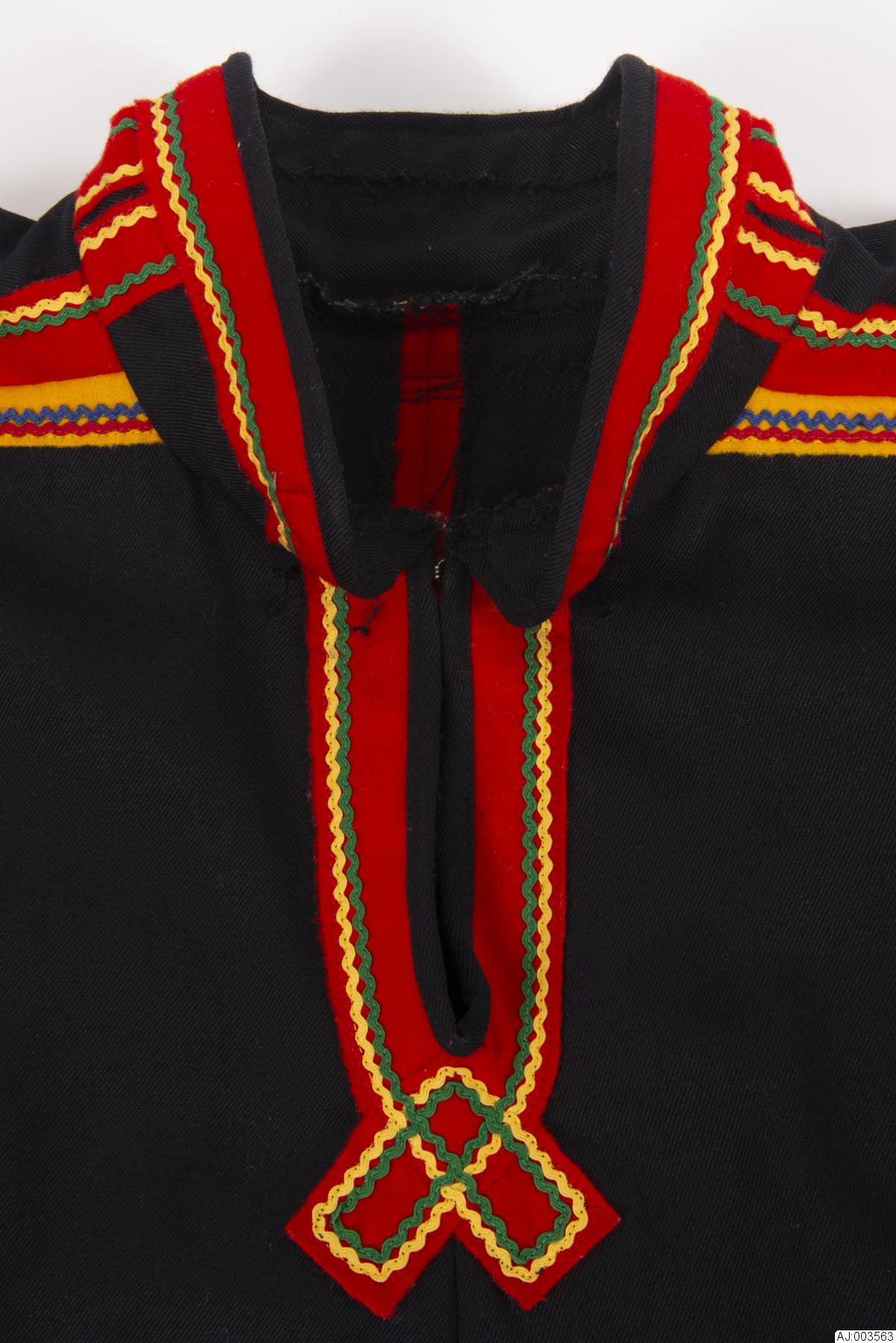 Pojkskolt i Karesuandomodell. Sydd av svart gabardintyg, kypertvävt. Pojkkolt i Karesuandomodell. Sydd av svart gabardintyg, kypertvävt. Ovdabealli/framstycke med söm mitt fram. Sealgebealli/bakstycket består av fyra våder, olli. Röda klädesremsor i sömmarna mellan ryggvåderna. Veckad kjoldel. Kortare fram än bak. Kolten är dekorerad med bårder av rött och gult kläde och röda, gröna, gula och b...