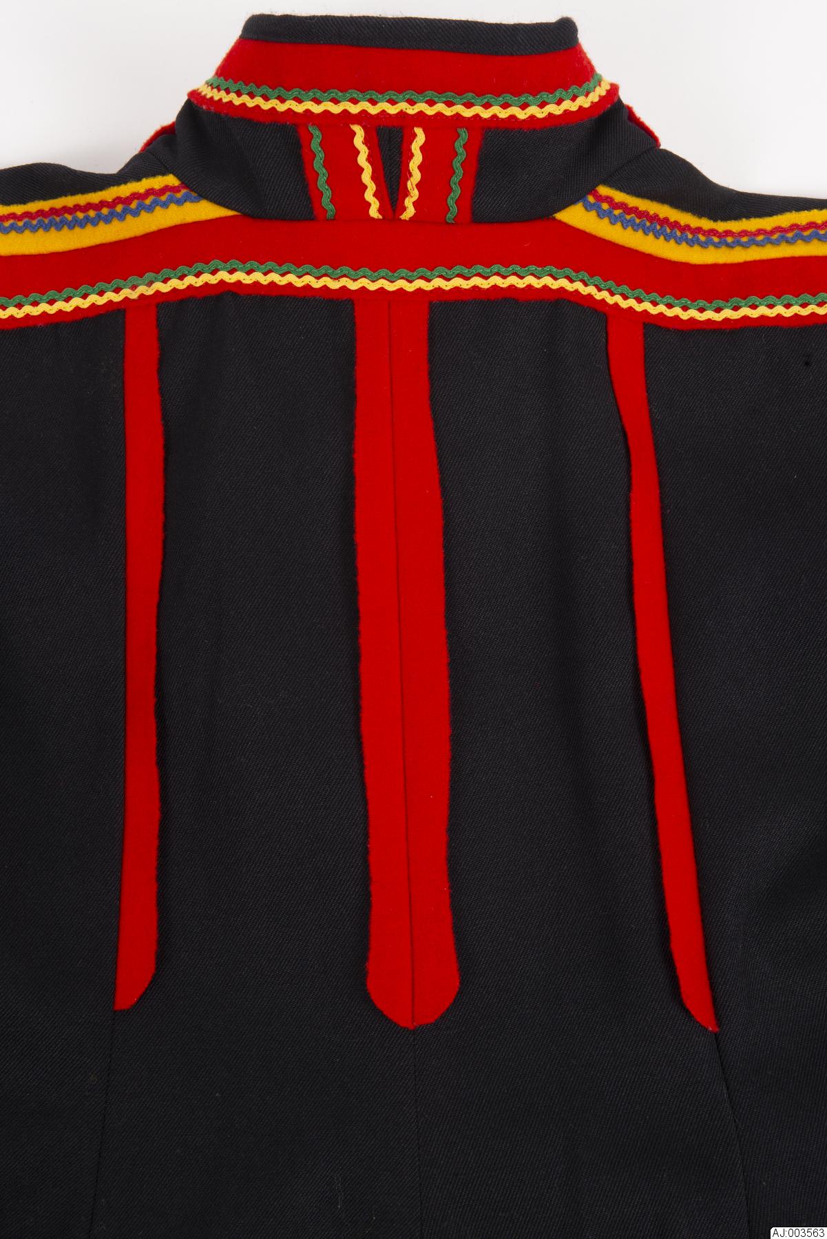 Pojkskolt i Karesuandomodell. Sydd av svart gabardintyg, kypertvävt. Pojkkolt i Karesuandomodell. Sydd av svart gabardintyg, kypertvävt. Ovdabealli/framstycke med söm mitt fram. Sealgebealli/bakstycket består av fyra våder, olli. Röda klädesremsor i sömmarna mellan ryggvåderna. Veckad kjoldel. Kortare fram än bak. Kolten är dekorerad med bårder av rött och gult kläde och röda, gröna, gula och blå sicksackband. I v-ringningen röd klädesbård lagd i kors mitt fram, dekorerad med gröna och gula sicksack-band. Hyska och hake i halsen. V-ringningen kantad med samma tyg som kolten. Hyska och hake i halsen. Kragen har lodräta dekorationer av rött kläde, = stáhppečeabet.