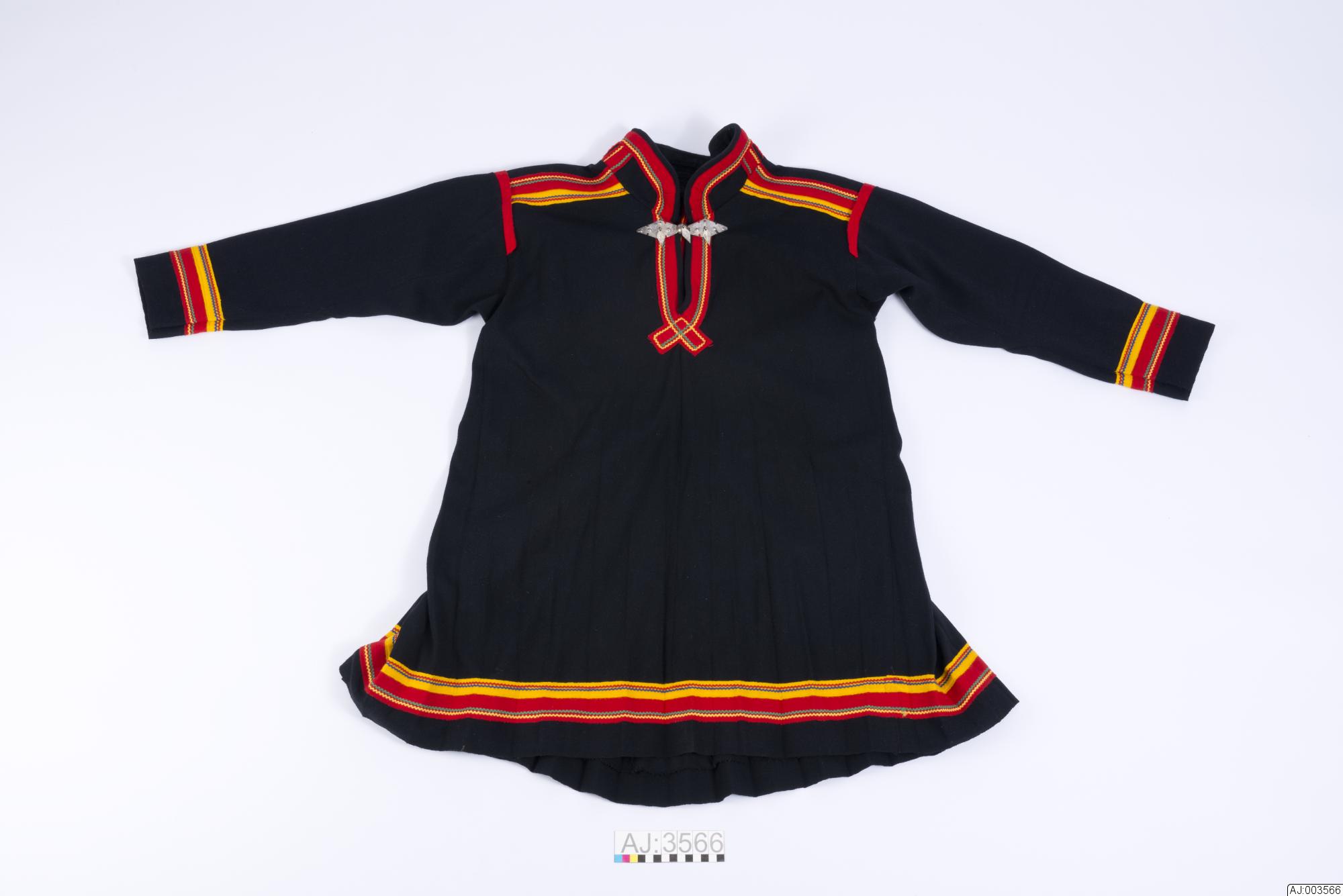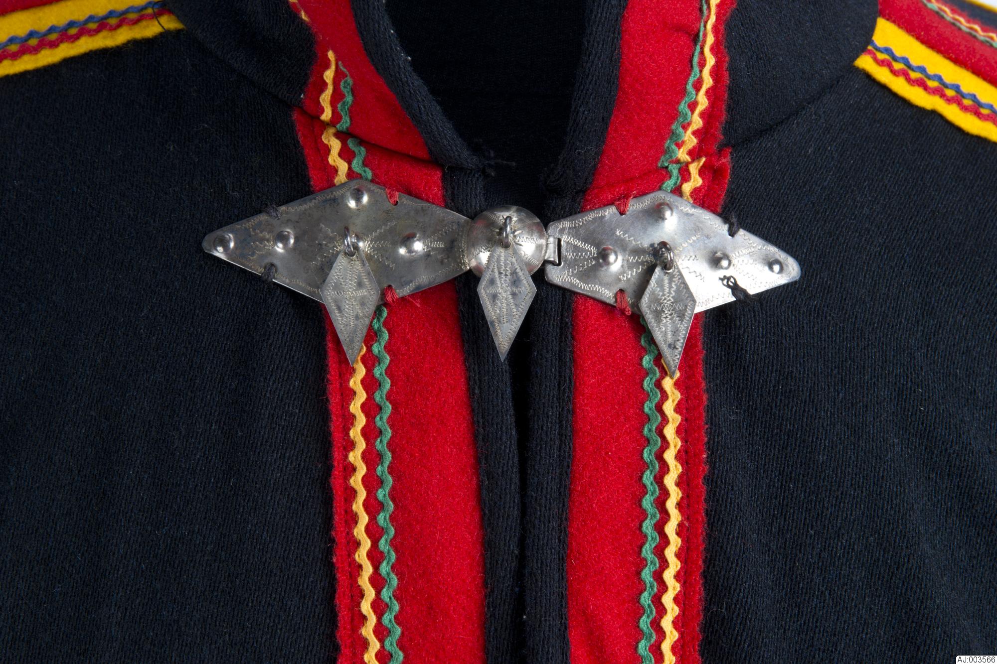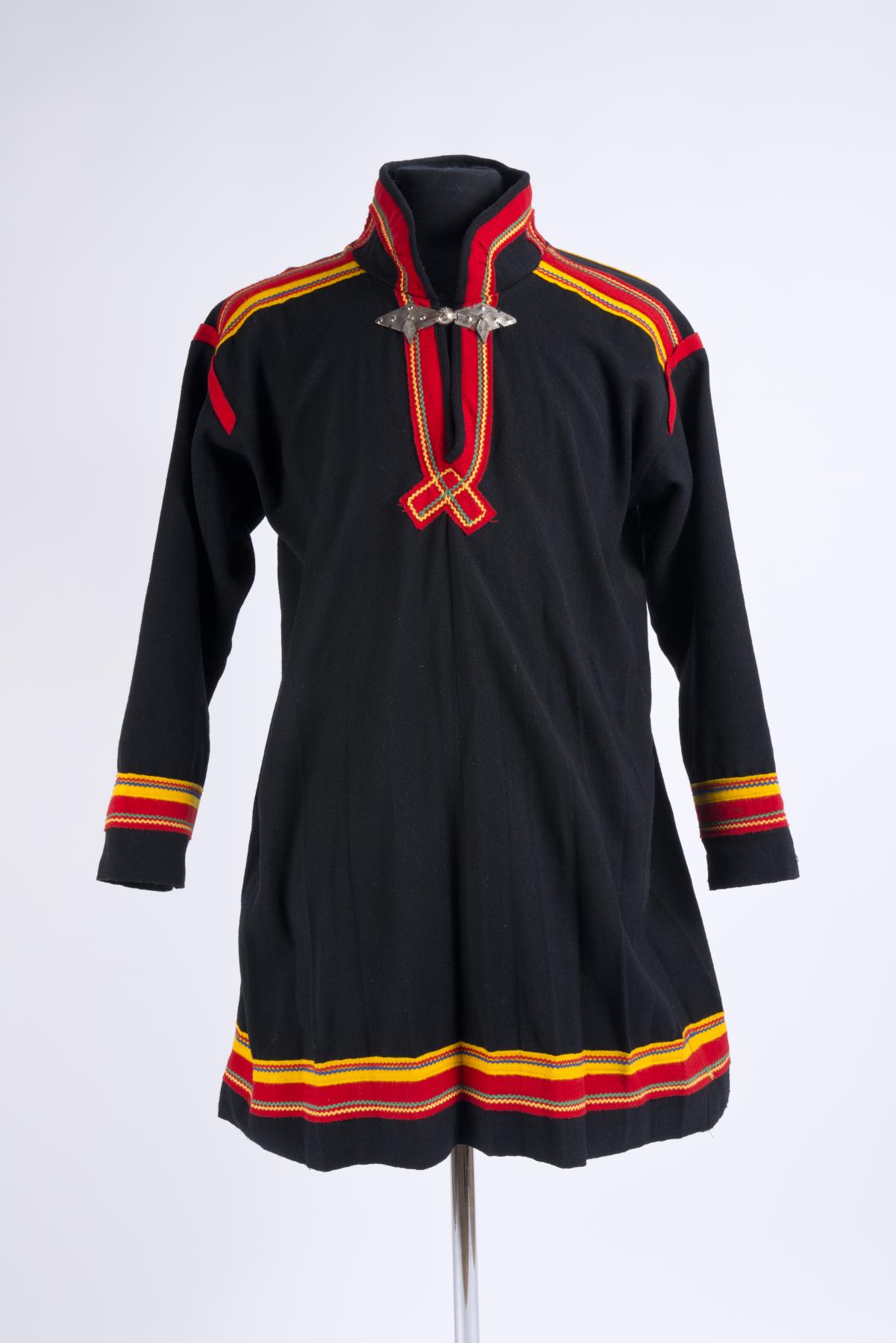 Manskolt i Karesuandomodell. Sydd av svart kläde. Ovdabealli/framstycke med söm mitt fram. Sealgebealli/bakstycket består av fyra våder, olli med två kilar, gáida, i kjoldelen. Ingen kil mitt bak. Klädesbårder emellan våderna: i mittsömmen: rött kläde med gul klädesremsa emellan, i sömmarna mot yttervåderna: rött och gult kläde, ingen klädesremsa emellan. Dekorerade med raksömmar av blå och röd tråd. Ärmen sydd i traditionell modell med kil och söm fram. Veckad kjoldel. Kolten är kortare fram än bak Kolten är dekorerad med bårder av rött och gult kläde och röda, gröna, gula och blå sicksackband. I v-ringningen röd klädesbård lagd i kors mitt fram, dekorerad med gröna och gula sicksack-band. V-ringningen kantad med samma tyg som kolten. Silverspänne i halsen, med tre hängande löv. Kragen har lodräta dekorationer av rött kläde med påsydda gula och gröna sicksackband, =stáhppečeabet. Hank i nacken för upphängning.