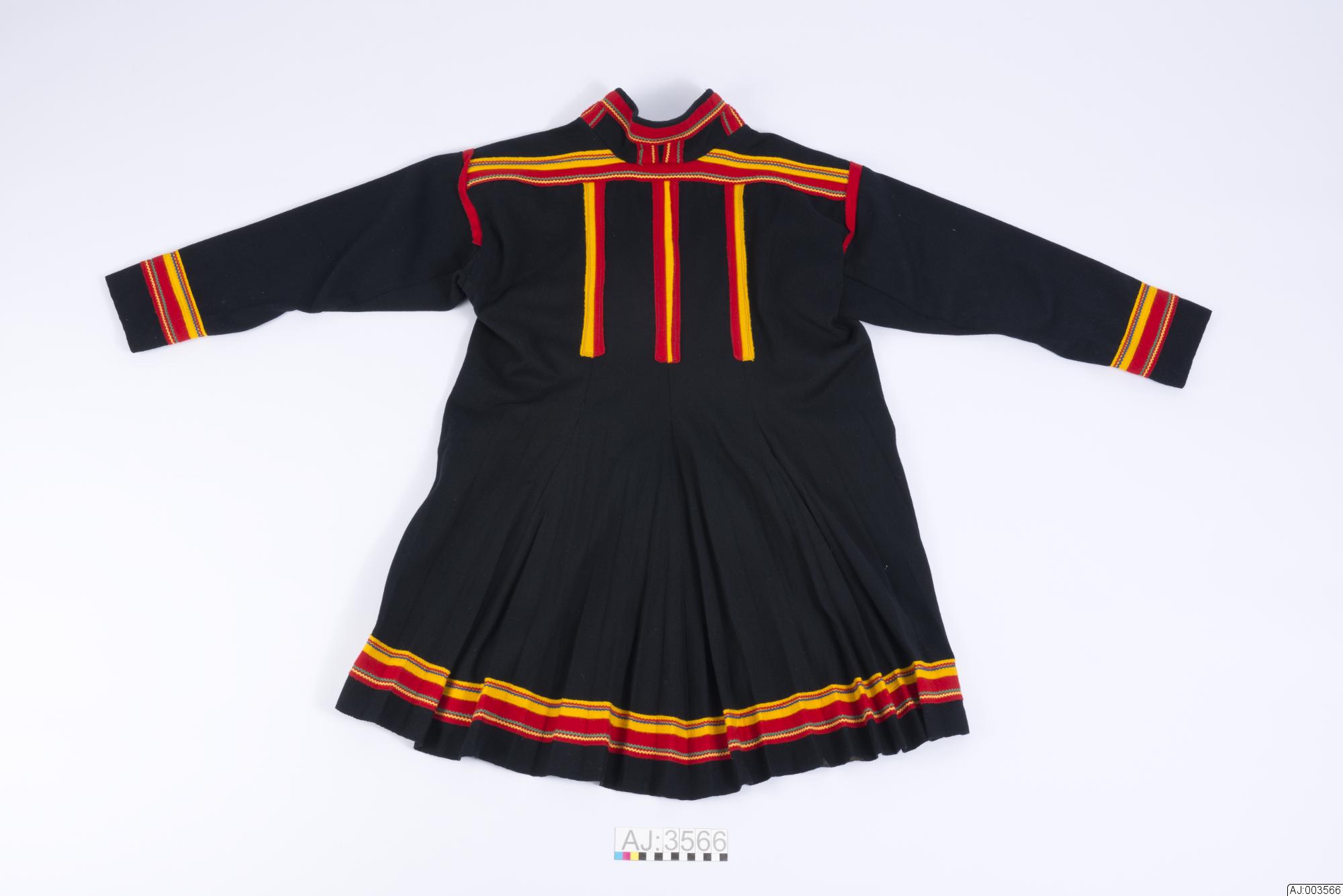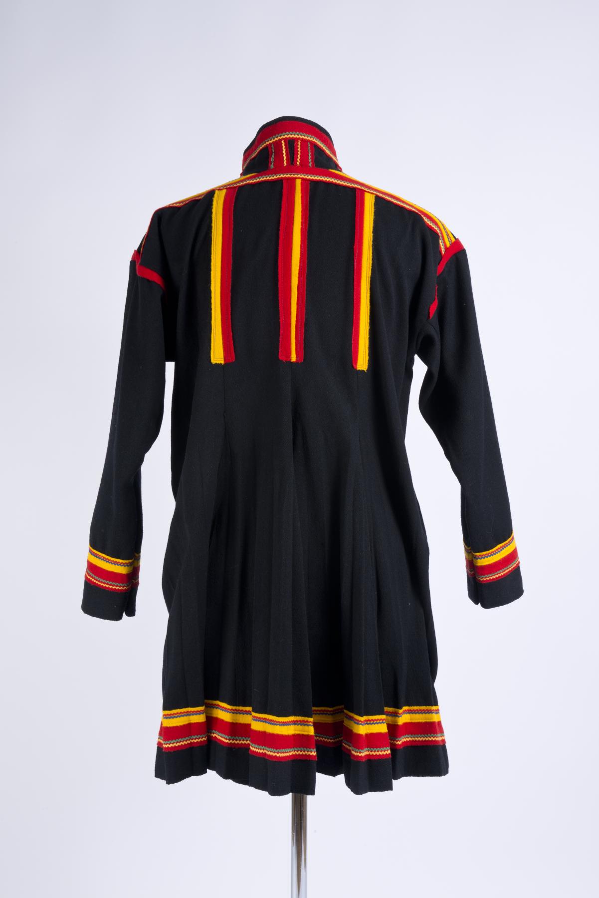 Manskolt i Karesuandomodell. Sydd av svart kläde. Ovdabealli/framstycke med söm mitt fram. Sealgebealli/bakstycket består av fyra våder, olli med två kilar, gáida, i kjoldelen. Ingen kil mitt bak. Klädesbårder emellan våderna: i mittsömmen: rött kläde med gul klädesremsa emellan, i sömmarna mot yttervåderna: rött och gult kläde, ingen klädesremsa emellan. Dekorerade med raksömmar av blå och röd tr...