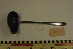 • En soppslev i metall med ett långt handtag. Själva sleven är lite äggformad