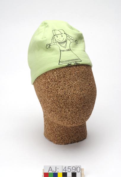 Mössa av grön bomullstrikå med foder av ljusblå fleece. Toppluve-modell, men låg så den går tätt efter huvudet. En söm bak och tre sömmar högst upp, som formar toppen. Mössan har ett tryck i svart: en flicka i sydsamisk kolt. I baksömmen en svart etikett med texten " Ealli Design. Made in Sápmi".