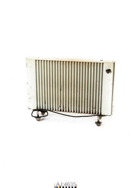 Elektriskt element av järn. Vitmålat. I ena kortsidan sitter en sladd med en elkontakt i änden. På ena långsidan finns ett vred av plast att slå av och på elementet med. Det går att välja melklan tre värmelägen. Elementet står på fyra hjulförsedda fötter, dvs. det är ett flyttbart element. På elelmentet finns texten: Elektro Helios. På ovansidan sitter en metallbit fastsatt med texten: varning övertäckning medför brandfara, tillse att brännbara föremål ej finns invid kaminen. På ena kortsidan sitter en metallbit med texten: ELektro Helios, V 220, 1000 W, typnr 22147, sernr 463. S-märke i en ring, Made in Sweden, Fabrique en Suede, samt en droppe.
