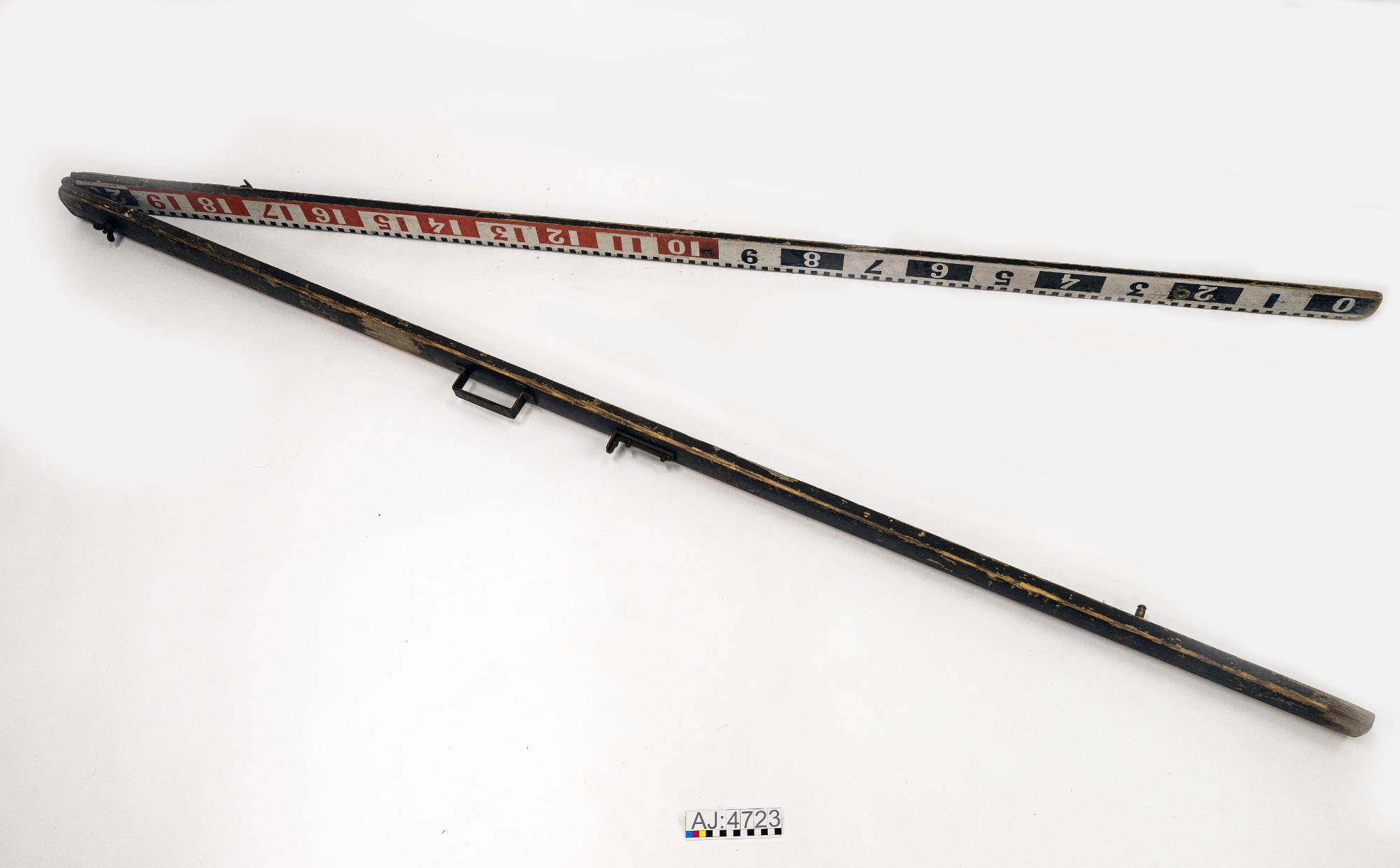 Lantmäteriutrustning för uppritning av kartor. Uppfällbar mätsticka/måttstock i två delar av trä med gångjärn på ena kortsidan. Måtten är målade. På utsidan sitter ett bärhandtag och järndel (för oss okänd användning). För att fälla upp mätstickan, måttstocken skruvar man loss en mutter för att fälla ut den. På andra brädan sitter en "arm" av järn som man fäster med muttern, för att hålla de två ...