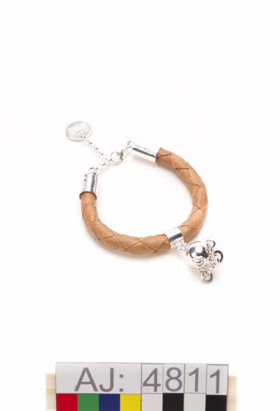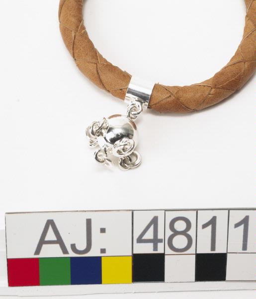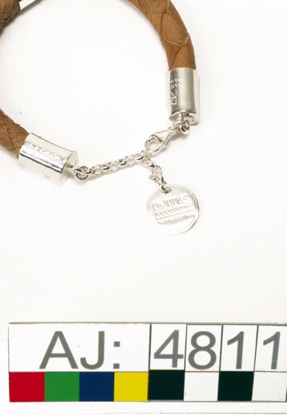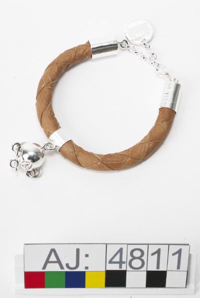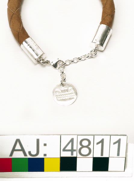 Armband av barkgarvat renskinn med smitt silver och silverhängen, levererad i ask av svart papp. Armbandet är en fyrfläta, flätad omkring en kärna av hampa, för att hålla formen. Låset är av silver, där hänger en rund platta med texten "OVTTAS HANNA&ERICA" och ett mönster (två parallella streck med en sicksack-linje emellan) inristat. I låset är tillverkarnas signaturer och namn instämplat. Armban...