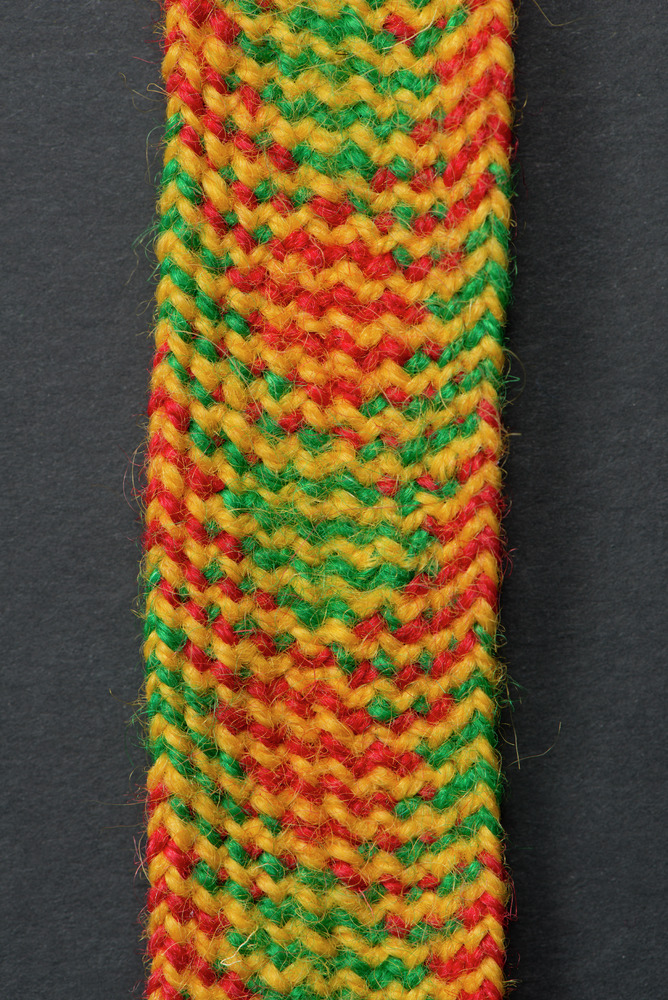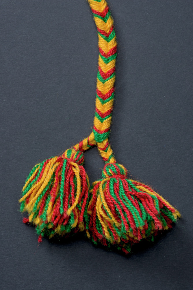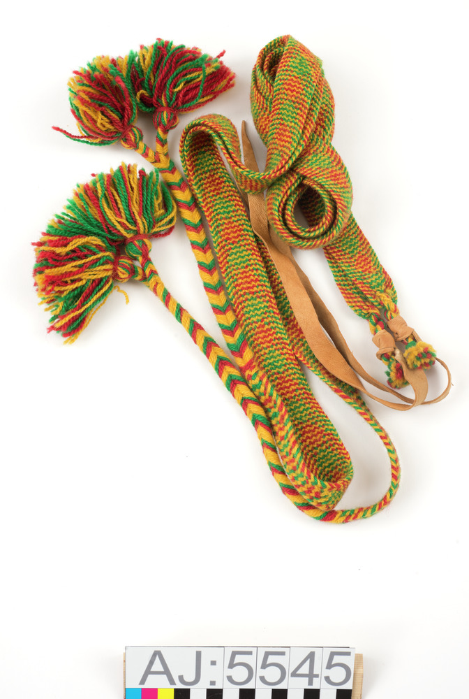 • AJ 5544:1-2 ett par sydsamiska skoband för man. Lagda/flätade av ullgarn. I ena änden en skinnrem för att knyta fast i skon i andra änden en fläta med tofs.