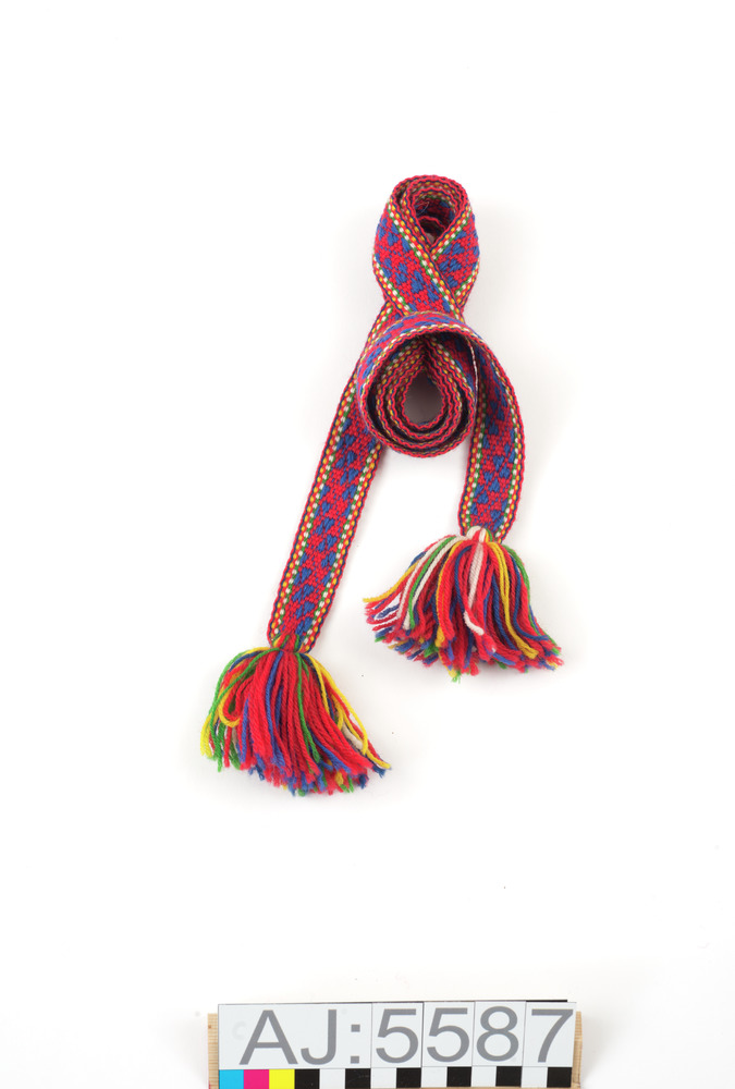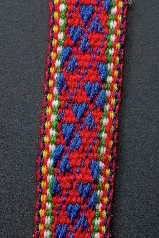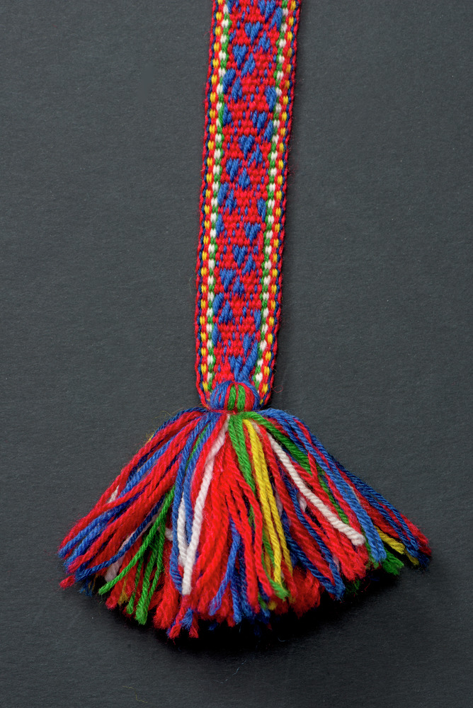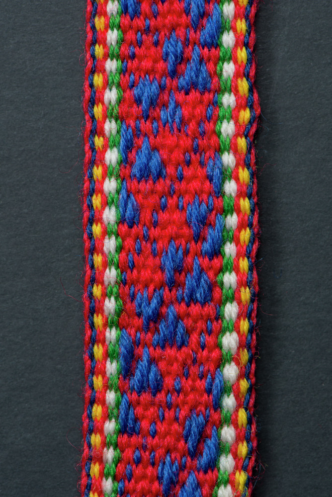 • Mönstervävt band av ullgarn. Avslutas med en tofs i varje ände. Färger: rött, blått, vitt, grönt, gult, svart.