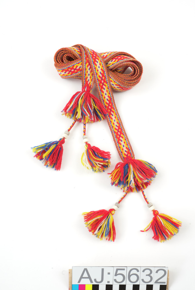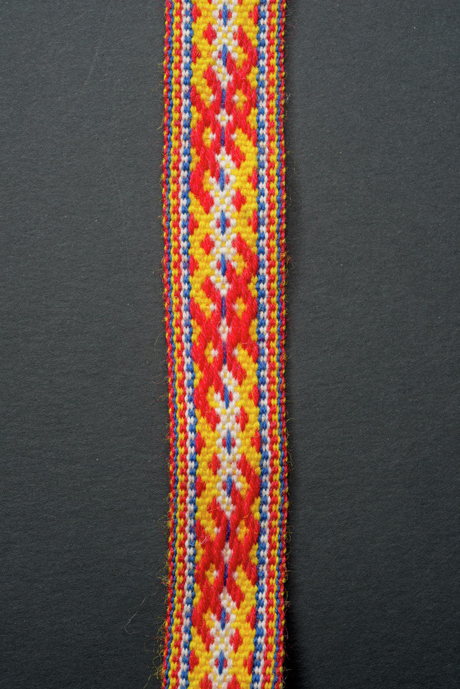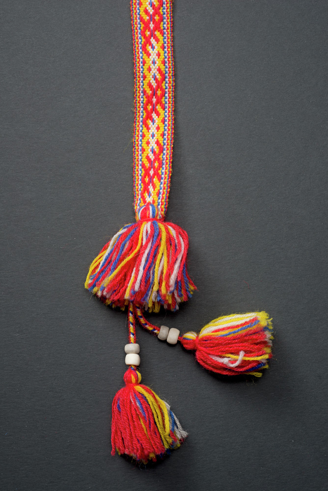 • Ett par nordsamiskt förklädesband för kvinna. Vävd med ullgarn. Båda ändarna avslutas med två flätade band med två påträdda hornpärlor och en tofs.