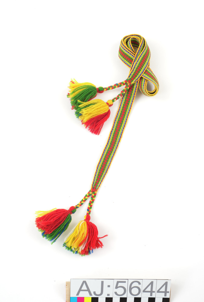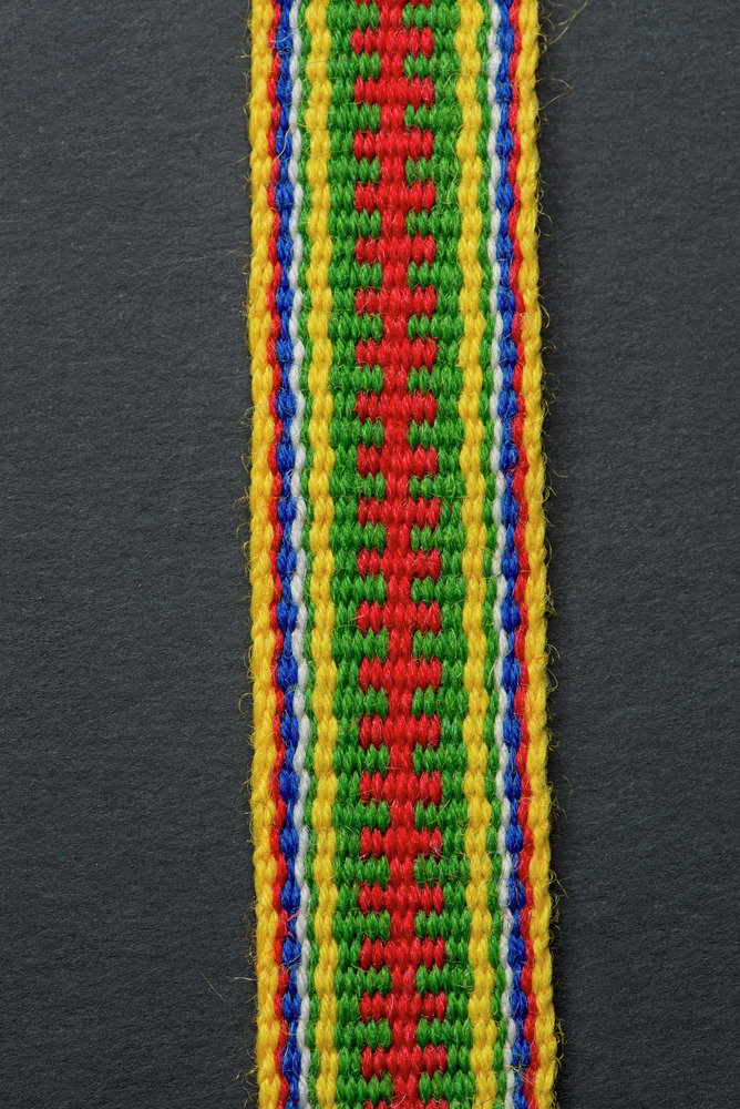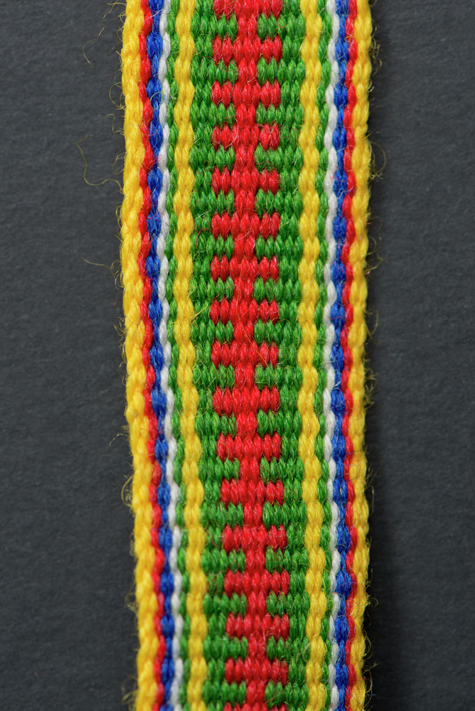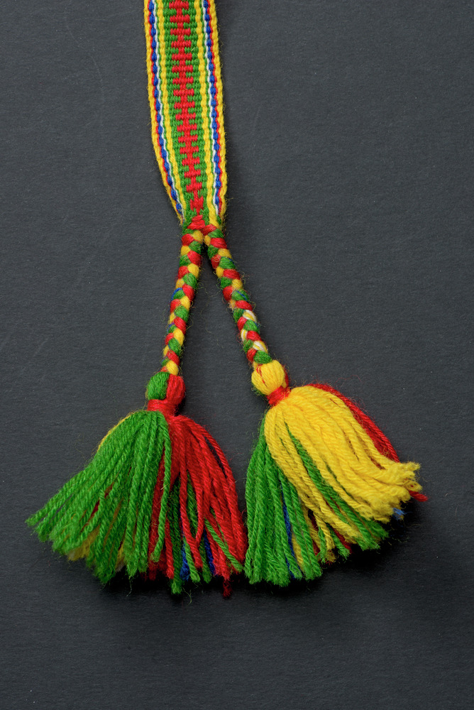 • Mönstervävt band av ullgarn. Varje ände avslutas med två flätor med tofs.