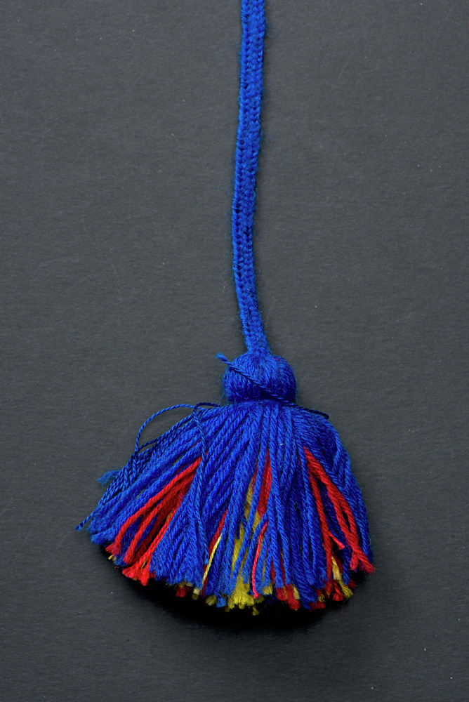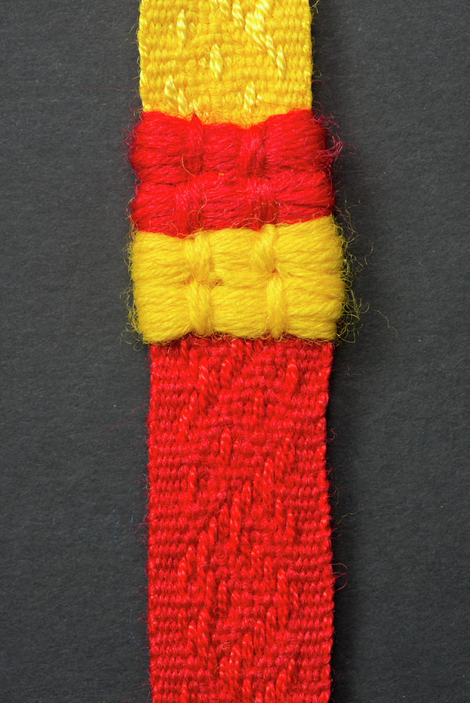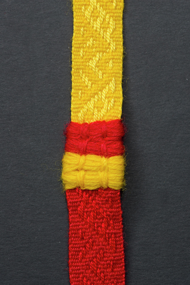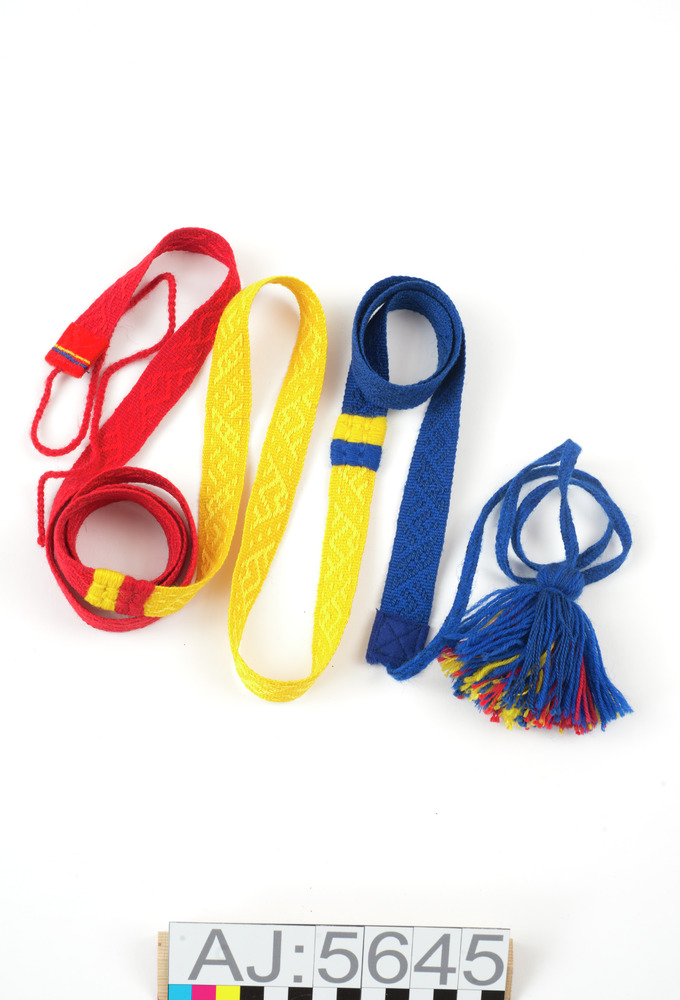 Ett skoband av ett par. Jukkasjärvi skoband för kvinna i tre färgfält; gul, röd och blå. För kvinna. Vävda med ullgarn med mösntertrådar av mercericerat bomullsgarn. I båda bandändarna är klädesbitar fastsydda, en röd och en blå. I ena änden ett flätat band för att knyta fast i skon. I andra änden ett flätat band med tofs.