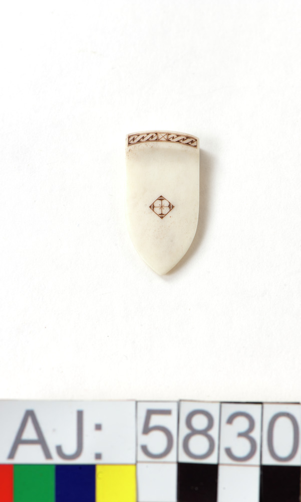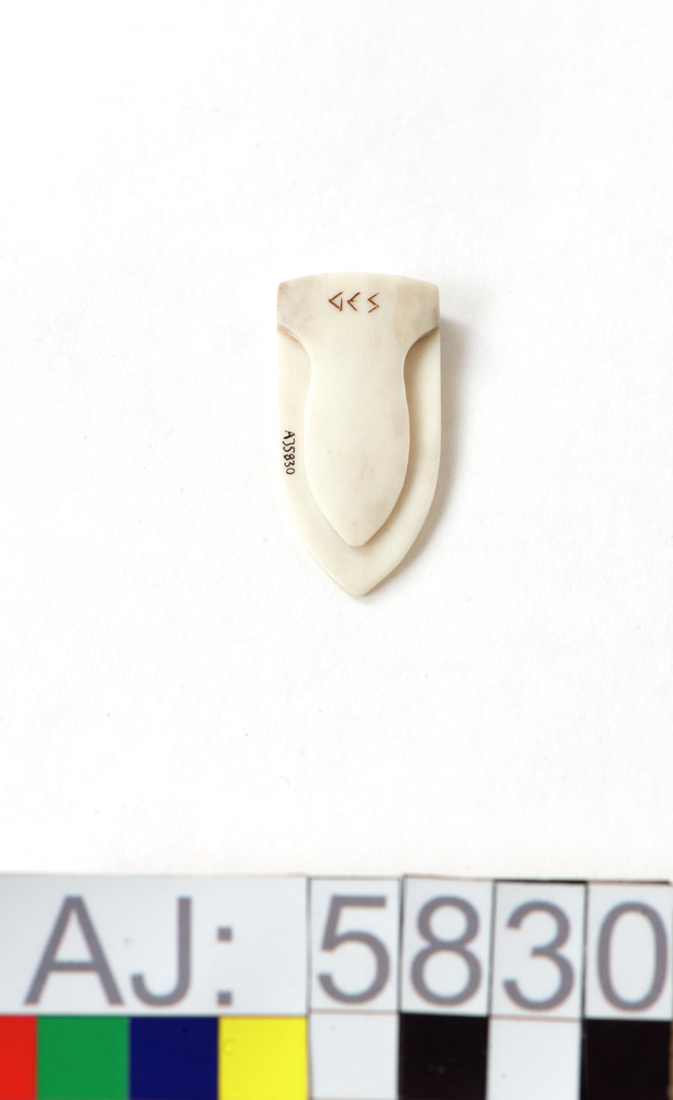 Bokmärken av renhorn. Graverad, i överkant med ett flätmönster och i mitten med en liten fyrkant med mönster i. Bokmärket finns med på fotot för föremål AJ 5503.