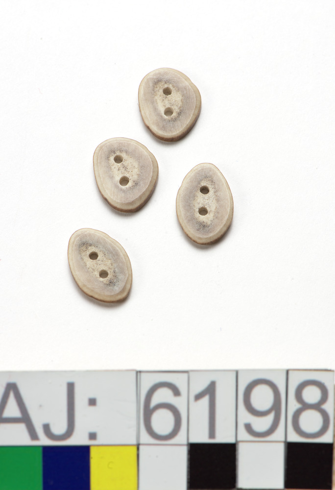AJ:006198:1-4Föremålet är fyra ovala, platta knappar av horn i en plastpåse. I varje föremål finns två hål.