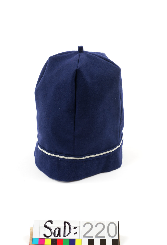 • Föremålet är en blå klädesmössa i modell Arjeplog, för män. Mössans kulle är sydd av fem kilar och längst ner är en hel remsa fast sydd. På sömmen mellan kullen och den avlånga biten, i mössans nedre del är et sytt fyra varv av tenntråd. Under tenntråden är en remsa av kläde, i samma färg som mössan . I toppen på mössan finns en liten "knapp", tillverkad av en bit rullad kläde.