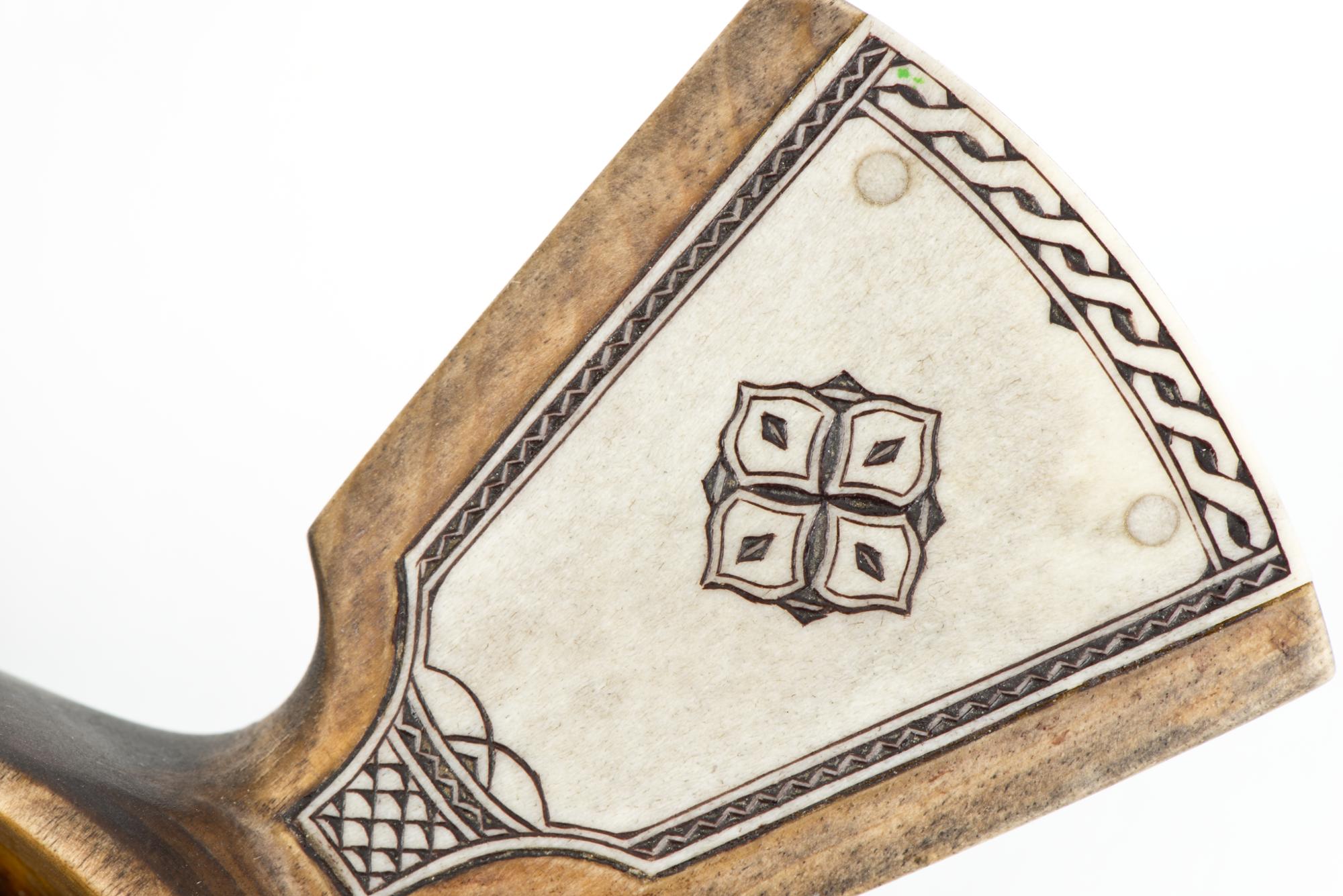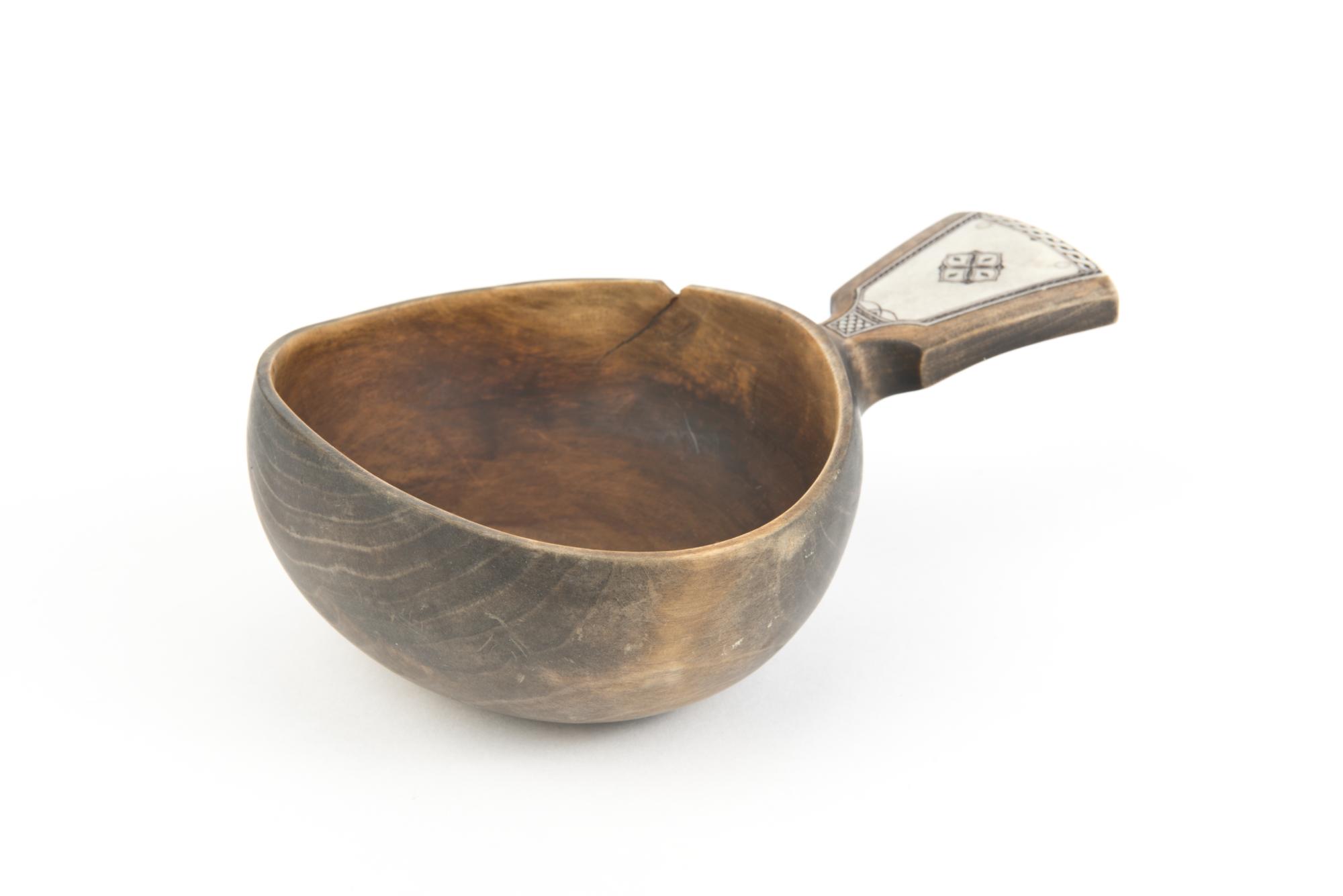 • En kosa med ett horninlägg i skaftet. En spricka på vänster sida.