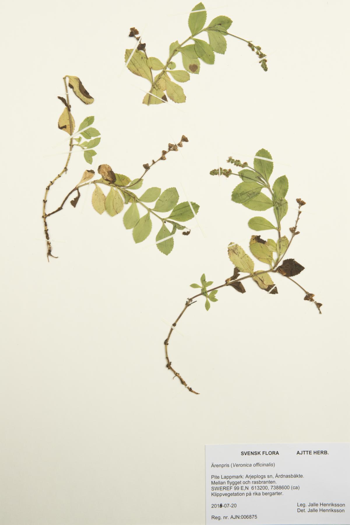 • Ärenpris har normalt en sydligare utbredning än den här insamlade från en sydbrant nära fjällen i norra Arjeplog. Där växte den tillsammans med andra värmekrävande växter som bergglim, femfingerört och lundelm, men också med fjällväxter som purpurbräcka, lapparv och fjälldraba.