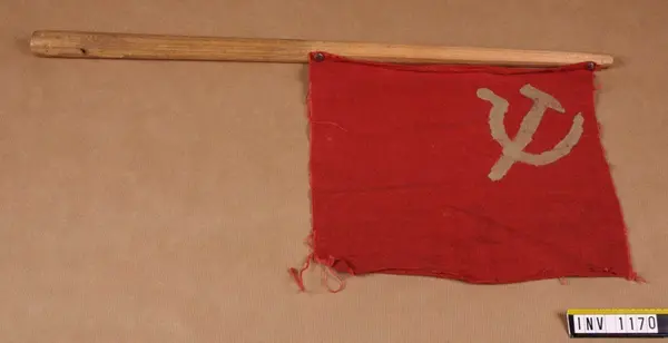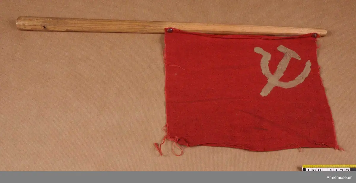 Så kallad Sovjetvimpel, hemmagjord modell. Av provisoriskt material, rödfärgat linnetyg. Vimpeln är fastsatt vid pinnen, längd 570 mm, diam 30 mm (upptill 15 mm), med två häftstift. Hammaren och skäran är påmålade på ena sidans övre inre hörn. Vimpeln är tillverkad på öppen kant utan söm.