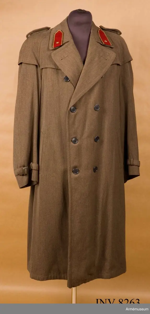 Trenchcoaten är dubbelknäppt och med åtta civila grå knappar. På kragspeglarna som är röda är en fänrikstjärna fäst. På axelklaffarna är kustartilleriets vapenslagsmärke, luftvärnskanoner och en kanon...
