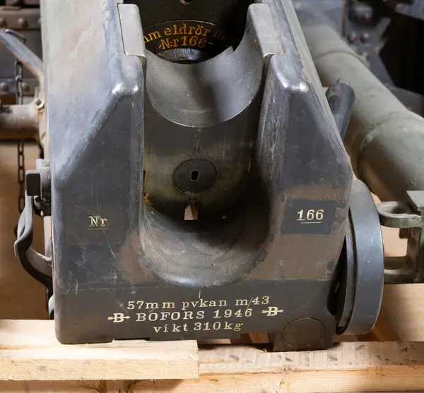 Pansarvärnskanon m/1943, system Bofors, med tillbehör. Vikt: 975 kg. Kaliber: 57 mm. Tillv.nr: 166. Eldrörets vikt: 310 kg, märkt: 57 mm pvkan m/43 B Bofors 1946 B vikt 310. Stålhjul med halvmassivgummihjul, d:700 mm. V -lavett. Kikarsikte m/1943, Nr:161. Största skottvidd: 8500 m. Rekylkraft: 2100 kg. Tillbehör: 1 pjäslåda nr: 161 (11 904 62000), 1 pjäsväska nr: 161 (11 904 61000), 1 kikarlåda me...