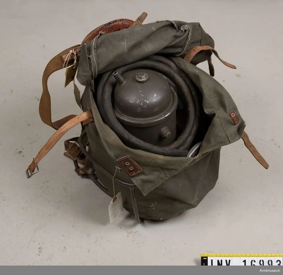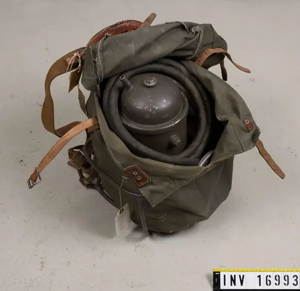 Vikt: 12.7 kg. Består av: 1 mes med bäranordning och fodral av väv. 1 vattenreningsfilter m/1941, S 253. 1 sugslang med sugkorg, märkt "Källan patent nr 75427 och slangkoppling". 2 filtercylinder, 2 bult med mutter, 2 packningar av läder, 1 slippapper i ask, 1 kombi.nyckel, 1 rensverktyg.