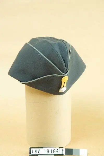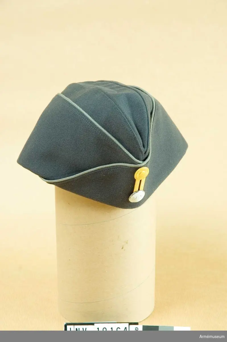 Av stålgrått tyg. Fasonerade slag och kulle samt passpoal, grå, på slagen som omlottas framtill. Framtill agraff för tjänstegrupp 3 med silverknapp tre kronor. Foder märkt "SVEA 61" och kronstämpeln....