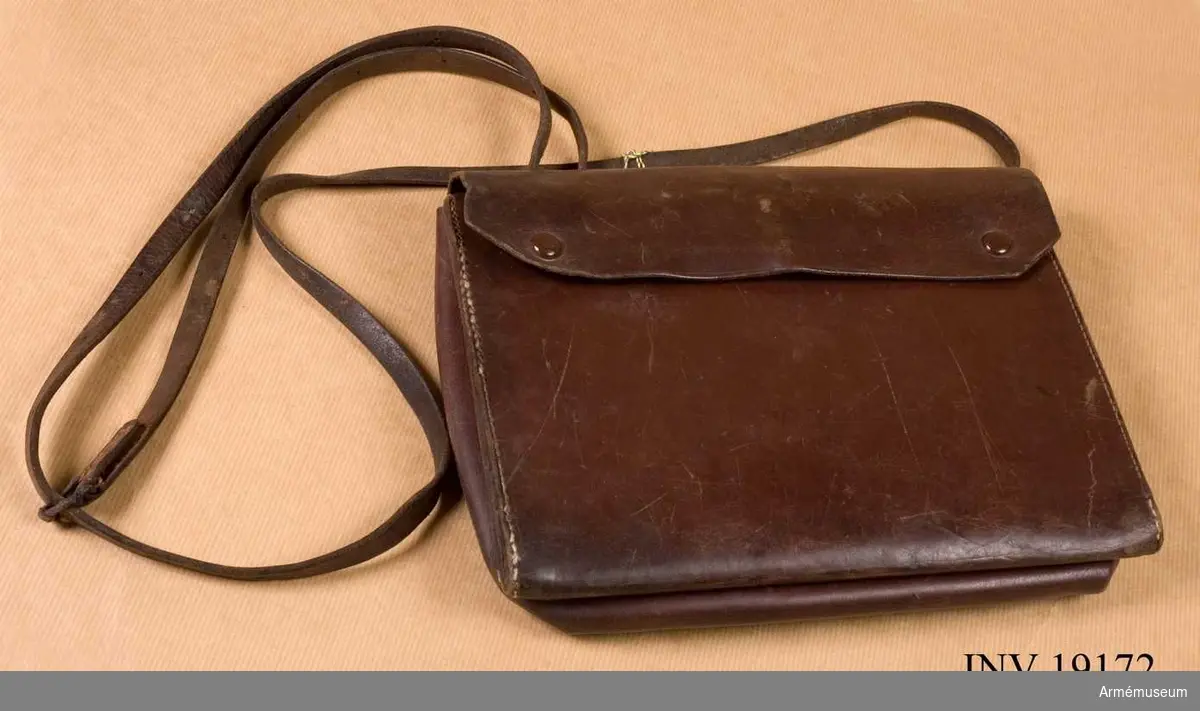 • Av brunt läder med lock knäppt med två tryckknappar. Försedd med kartfodral och fack för linjaler och pennor. På baksidan ringar för axelremmen.