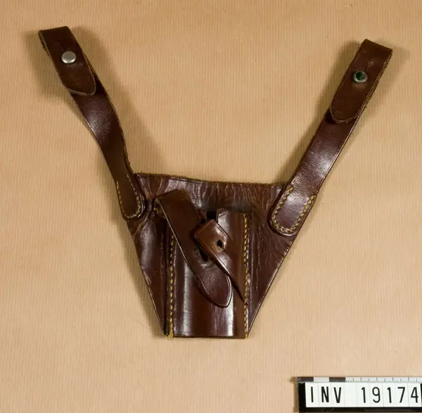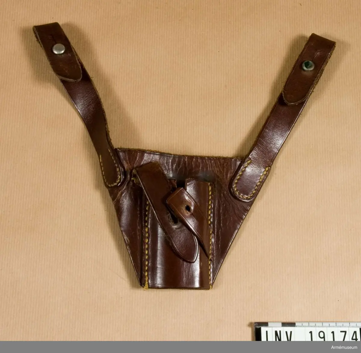 • För officer. Av brunt läder med tunnel för bajonet. Bäranordning för bajonett.