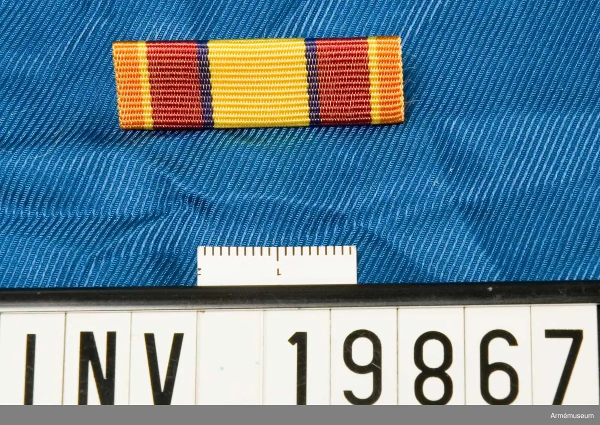 Bandet är mörkrött med en bred gul rand på mitten på vardera sidan åtföljd av ett blått streck samt med orange kanter åtföljda av ett gult streck. Släpspännet förvaras i ask tillsammans med en medalj och en miniatyrmedalj.