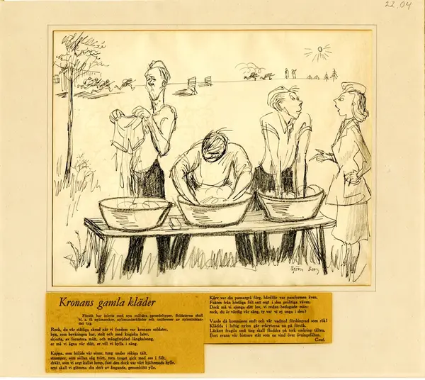 Tuschteckning av Björn Berg, "Kronans gamla kläder". Införd i Dagens Nyheter 15.6 1952.