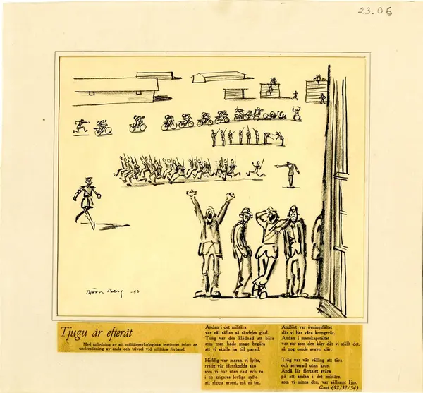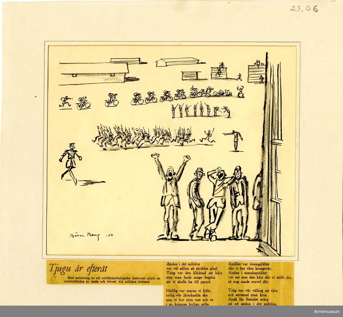Grupp M I.Tusch- och kolteckning av Björn Berg. "Tjugu år efteråt". Införd i Dagens Nyheter 8.10 1960.