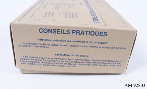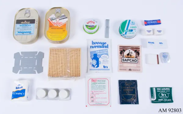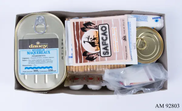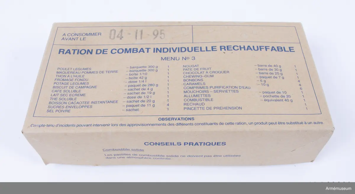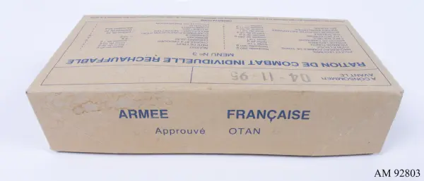 • Individuell återvinningsbar stridsportion i kartong märkt "Ration de combat individuelle rechauffable" med utgångsdatum 04-11-1995. På sidan märkt: "Armee Francaise Approuvé OTAN". Förpackningen skulle alltid tas med tillsammans med flaskvatten inom UNIFIL då man åkte i Area of Operation (AO). Den tillhandahölls av franska armén.