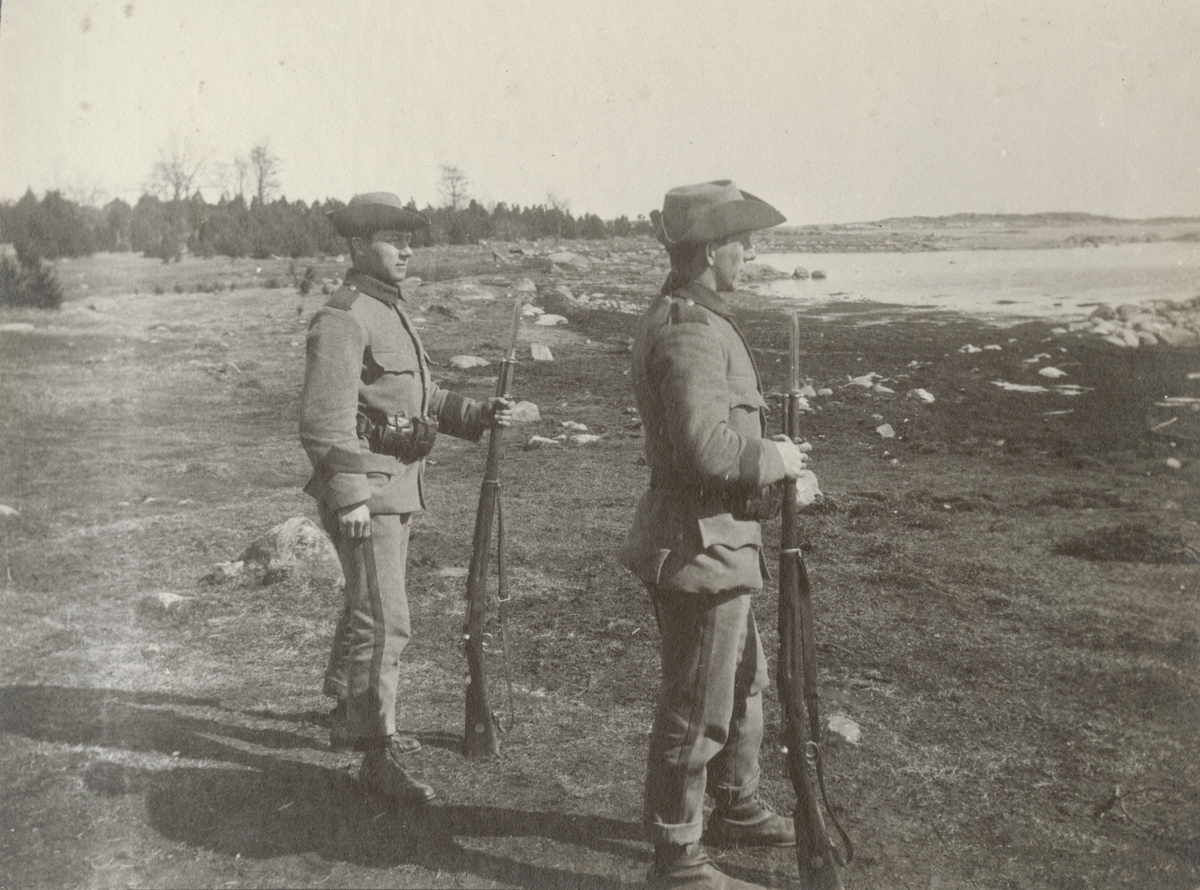 • Två soldater från Göta livgarde I 2 på stranden.