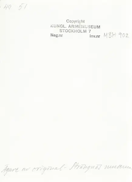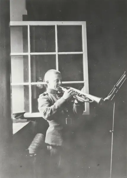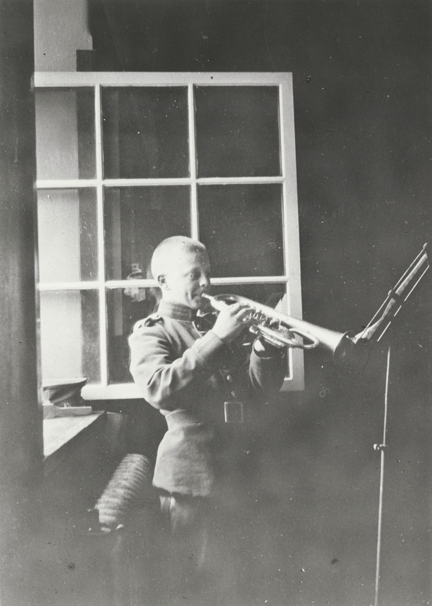 Man i uniform spelar horn efter noter vid ett öppet fönster.