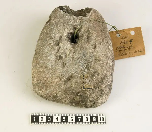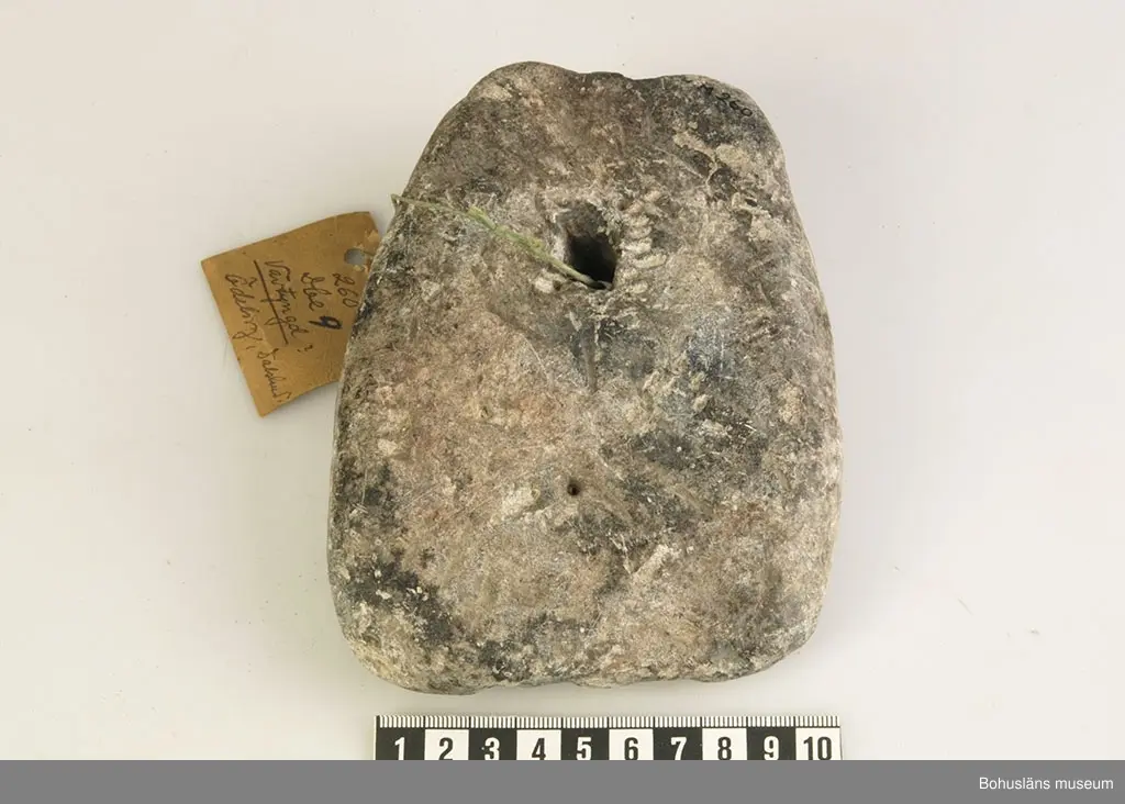 L.15 cm, Br.11,2 cm. Fyrsidig vävtyngd eller sänksten. Något skadad. Ett hål. Ödeborg Dalsl.