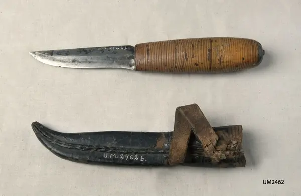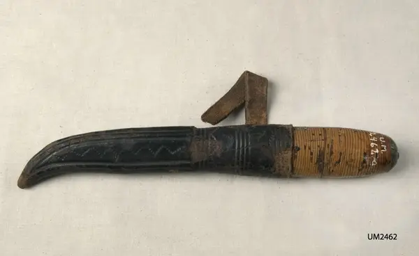 • Knivens skaft är gjort av näver som packats tätt kring tången. Slida av svartfärgat läder med inpressad dekor. Upphängningsögla av läder, skadad.