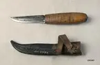 Knivens l.: 19,6 cm, varav knivbladets l. utgör 9,4 cm Ngtr rostig. Brunt skaft. b) Svart läderslida m. ögla. L.: 16,6 cm. Nött. Öglan trasig.
