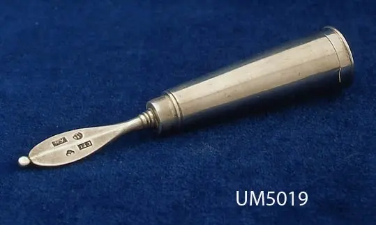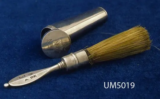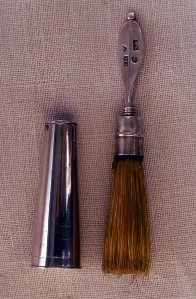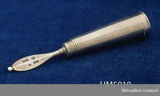 Föremålet visas i basutställningen Uddevalla genom tiderna, Bohusläns museum, Uddevalla. 394 Landskap BOHUSLÄN Konisk form på borsten, med slätt,odekorerat ,spetsigt handtag med ås och silverstämplar. Lock längst ner för borstet med ingraverat monogram: "HHS" för nu okänd person. Carl Fredrik Jonssén (1806-1859) mästare i Uddevalla 1831-1859. Hans hustru, änkan Charlotte Jonssén, född Ljungström (1810-1890), fortsatte verksamheten och stämplade 1859-1890, sterbhuset till 1891. Litt.: Artikel i Bohuslän årsbok 2000, "Bohusläns museums silversamling", Stellan Granat. Ur handskrivna katalogen 1957-1958: Reserakborste fr. 1852 av silver Borstens l.: 10,5 cm. Fodral i form av en nedåt avsmalnande cylinder. På locket "IHH". Uddevalla stads vapen på skaftet. Föremålen hela. Från Kärra, U-a. IHH = Johan Henrik Hellgren (1819 - 1890), se UM4947. Lappkatalog: 94