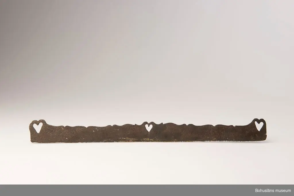 Platt avlångt bakredskap. Nertill har det små tänder. Kortsidorna och mitten är bredare med ett genombrutet mönster av hjärtan. Övre kanten är vågformad. Tänderna är slitna nertill. Kortsidans hjärtan är något defekta. Ur handskrivna katalogen 1957-1958: Brödnagg L. 45,7. Av järn. Obetydligt skadad. Något rostad.