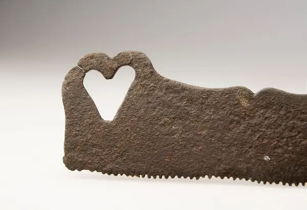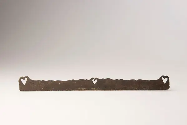 Platt avlångt bakredskap. Nertill har det små tänder. Kortsidorna och mitten är bredare med ett genombrutet mönster av hjärtan. Övre kanten är vågformad. Tänderna är slitna nertill. Kortsidans hjärtan...