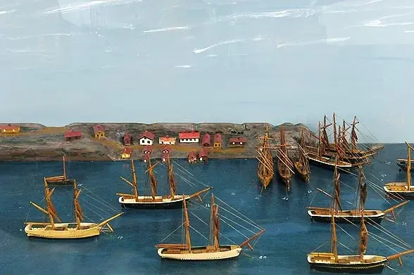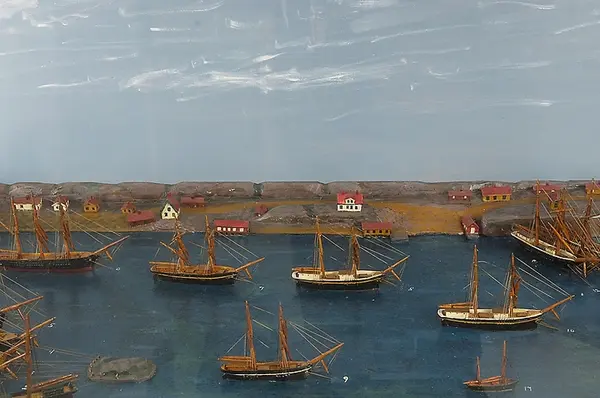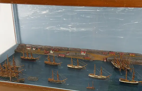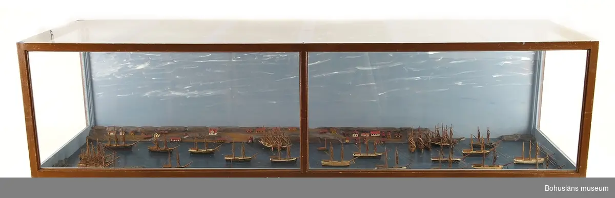 • Panorama i monter över Fiskebäckskils hamn på 1880-talet med 33 fartygsmodeller i vinterkvarter.