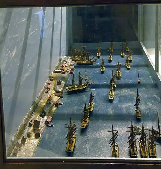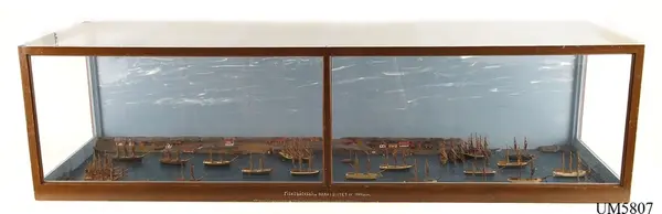 Största fartygsmodell längd 16 cm; monter 202 x 61 cm, höjd 53 cm; okänd skala. Vattenlinjemodeller av 30 råseglare, två större jakter och en galeas, ...