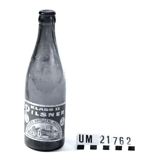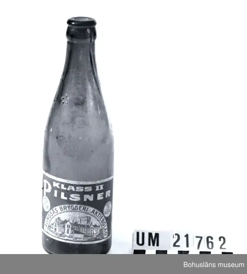 Etikett i vitt och blått med text: "Klass 2 Pilsner Alingsås Bryggeri Aktiebolaget", samt "Skånskt lito AB".