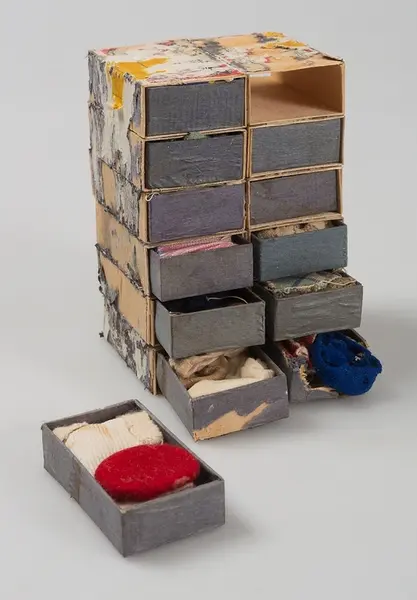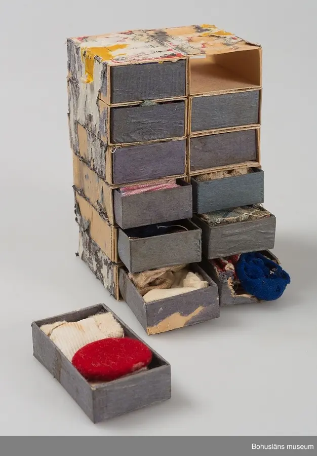 Tolv hoplimmade tändsticksaskar med div. dockkläder. Gaveln trasig på en låda i botten. Fragment av gult papper på utsidan. P