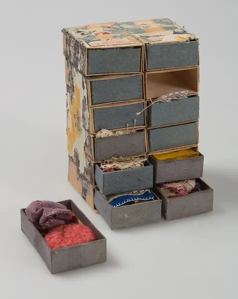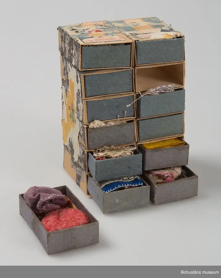 Föremålet ingår i en testamentarisk gåva till Bohusläns museum 14 mars 1990, Irma Bohlins dödsbo. I gåvan ingår en leksakssamling, främst dockor med kläder och en samling fotografier: Föremål UM023791 - UM023839 och fotografier UMFA53253:0001 - UMFA53253:0023. Materialet har ägts av systrarna Irma (1915 - 1990) och Rosa Bohlin (1915 - 1989), födda och döda i Norum socken i Stenungsund, Bohuslän. Systrarna var tvillingar och ogifta. Fadern, snickaren, senare byggmästaren Alfred Abrahamsson Bohlin (1865 1937) och Sofia Elofsson (1866 1904) hade barnen Thure Washington (1899 1961) och Isabella Linnea Gustava Bella (1902 1988). Familjen bodde i Uddevalla och barnen föddes här. När Alfred blev änkeman flyttade han och barnen till Alfreds mor, änkan Gustava Andreasdotter (född 1840) och hans ogifta syster Julia Karolina Abrahamsdotter (1873 - 1979), sömmerska. Alfred Bohlin och barnen bodde också en tid hos fotograf Ingeborg Enander vars ateljé han också byggde till. Alfred Bohlin gifte om sig 1911 med Gerda Matilda Patriksdotter (1886 1958) och fick barnen Alfhild Viktoria Bohlin (1912-07-22 1912-07-25), Östen Bohlin (1913 1929), Rosa Margareta Bohlin (1915-10-28 1989-12-01) och Irma Hellevie Bohlin (1915-10-28 1990-01-08). Familjen bodde i huset Alphyddan i Stenungsund som Alfred Bohlin byggde. Rosa and Irma fortsatte att bo i huset efter föräldrarnas död. När huset skulle rivas hyrde de istället ett grannhus av Stenungsunds kommun på Norra vägen 24 i Stenungsund. Rosa och Irma var till yrket sömmerskor och sydde det mesta såväl kläder som gardiner och dylikt till offentliga lokaler på beställning av kommunen. Leksakerna har de själva använt och tillverkat tillbehören till. I museets fotosamling finns flera fotografier av medlemmar ur familjen Bohlin tagna av Ingeborg Enander vid olika tider, varav några ingår i denna gåva.