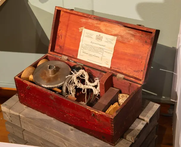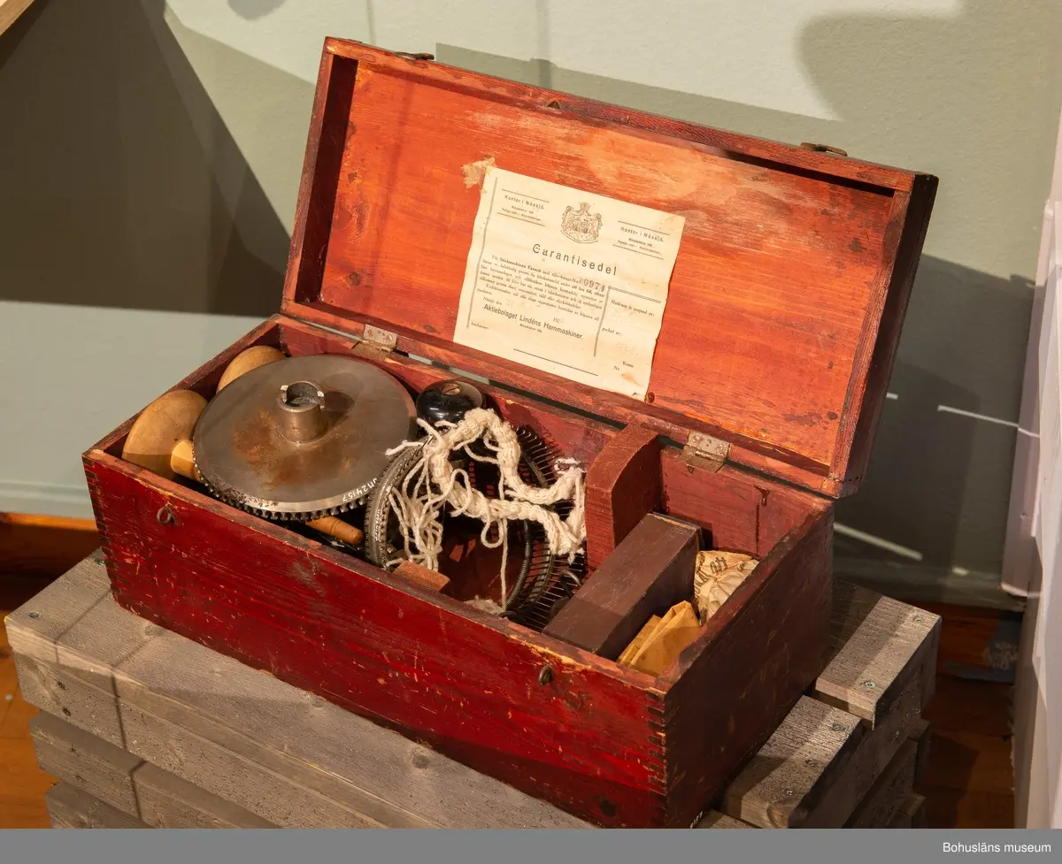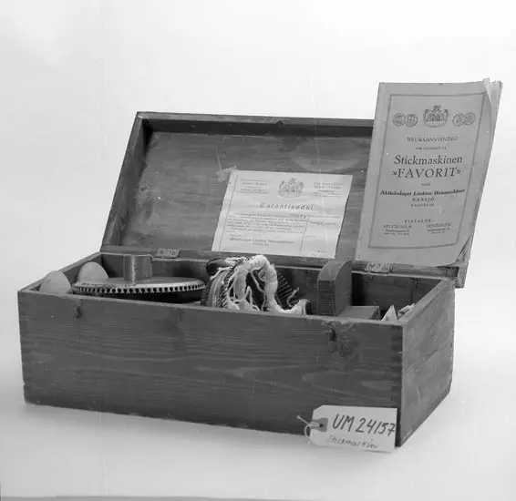 Lådan är betsade röd/brunt. Locket sitter fast med två gångjärn. Lådan stängs med två små krokar. På locket finns ett handtag av metall. På insidan locket finns en garantisedel utfärdad den 20 september 1920. Där står bl a att maskinen är avsynad av G.O och packad av H-d. Tillverkningsnummer: 6974. Lådan innehåller 3 st tyngder, mejsel, långkrok, spännfjäder, kort krok, arbetskrork, 2 st spolar, 1 st lös nålbädd, 2 st vikta ark innehållandes nålar, en tändsticksask med nålar, 2 st vaxbitar inslagna i papper, 1 st korg, 1 st ledarskiva med nålbädd, ett tomt kuvert samt häftet "Bruksanvisning för stickning på Stickmaskinen "FAVORIT" från Aktiebolaget Lindéns Hemmaskiner Nässjö Rikstelefon 162". I bruksanvisningen finns flera stickmönster på plagg till barn och vuxna, bl.a. "Stickad strandkofta för damer". Det fattas vissa delar jmrf med sid 77 - 78 i bruksanvisningen. Det finns ett "skruvjärn" som maskinen sätts fast med i bordsskivan. Denna är inte en originaldel.